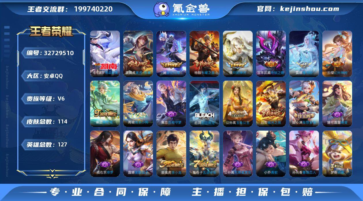 安卓Q【万战金标露娜/万战金标影】-V6-最强王者段位-127英雄-114皮肤-1珍品传说-8传说-31史诗 【英雄全皮】:敖隐全皮 【珍品传说】:马可波罗怪盗基德 【传说皮肤】:云缨幻光神枪,桑启鸣野蒿,澜逐花归海,露娜霜月吟,裴擒虎寅虎赤拳,镜炽阳神光,杨戬永曜之星,宫本武藏地狱之眼 【限定皮肤】:狄仁杰阴阳师,赵云皇家上将,孙尚香蔷薇恋人,夏侯惇朔风刀,狄仁杰魔术师,狄仁杰万华元夜,项羽海滩派对,老夫子醍醐杖,程咬金演武夺筹,后羿辉光之辰,李元芳云中旅人,杨戬永曜之星,雅典娜黎明之约,鬼谷子原初探秘者,鬼谷子五谷丰年,百里玄策原初追逐者,弈星混沌棋,梦奇顽趣,公孙离玉兔公主,明世隐疑决卦,裴擒虎李小龙,裴擒虎寅虎赤拳,裴擒虎擒涛扼浪,盾山御銮,鲁班大师探海日志,桑启海盐诗旅,阿古朵江河有灵,张良古海寻踪,蒙恬荣光圣徽,鬼谷子天穹祈灯,姬小满妄想食味,刘邦剑破天穹 【年限皮肤】:杨戬永曜之星,后羿辉光之辰,裴擒虎寅虎赤拳 【赛季限定】:盾山御銮,夏侯惇朔风刀,弈星混沌棋,明世隐疑决卦,老夫子醍醐杖,鬼谷子原初探秘者,狄仁杰万华元夜,程咬金演武夺筹,李元芳云中旅人,桑启海盐诗旅,裴擒虎擒涛扼浪,鲁班大师探海日...