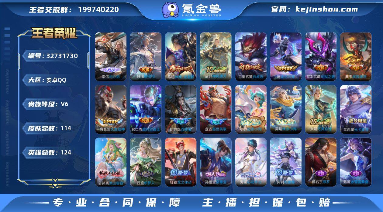 【极品猛男号·问心剑·踏浪归·神骥逐星野·战鼓燎原·逐花归海·白虎志·至尊宝·2个星传说·13个性按键】 安卓Q-V6-最强王者段位-124英雄-114皮肤-1无双-9传说-35史诗 【无双皮肤】:李信问心剑 【传说皮肤】:韩信踏浪归,马超神骥逐星野,后羿神树通天,典韦战鼓燎原,澜逐花归海,干将莫邪久胜战神,百里玄策白虎志,宫本武藏地狱之眼,狄仁杰超时空战士 【限定皮肤】:狄仁杰阴阳师,赵云皇家上将,孙尚香蔷薇恋人,元歌无心,狄仁杰魔术师,狄仁杰万华元夜,项羽海滩派对,程咬金演武夺筹,孙悟空至尊宝,钟馗驱傩正仪,鬼谷子原初探秘者,苏烈千军破阵,百里玄策白虎志,百里玄策原初追逐者,沈梦溪龙舞盛年,海诺心动手记 【年限皮肤】:百里玄策白虎志 【赛季限定】:鬼谷子原初探秘者,狄仁杰万华元夜,程咬金演武夺筹,钟馗驱傩正仪,苏烈千军破阵,太乙真人谧流熔炉,钟馗虚灵犬护,甄姬逆浪荇歌,亚瑟荣光之誓,百里玄策原初追逐者 【战令限定】:廉颇撼地雄心,莱西奥光弋星穹,明世隐往忆晖光,周瑜线条小狗,小乔线条小狗 【史诗皮肤】:明世隐百晓客,盘古撼世英歌,周瑜线条小狗,小乔线条小狗,女娲万灵启世,莱西奥光弋星穹,公孙离涂山容容,西施织梦人,狂铁龙...