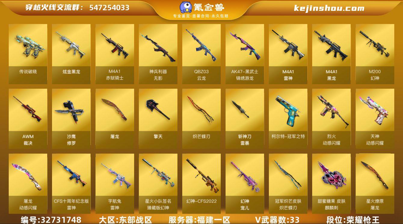 【ky5166】福建一区-33V-6王者-1炫金 【传说武器】:传说破晓 【热门武器】:传说破晓,M200-幻神,柯尔特-冠军之特,COP-白鲨,沙鹰-修罗,炽芒蝶刃,炽芒蝶刃-冠军炽芒皮肤 【王者炫金武器】:炫金黑龙 【皮肤】:幻神-宠儿-2021MVP,幻神-CFS2022,幻神-星火小队签名臻藏版 皮肤,白虎-AG-CFPLS20冠军,雷神-荣耀之魄,雷神-宇航兔皮肤,雷神-CFS十周年纪念版 皮肤,屠龙-星火燎原,麒麟刺-甜蜜糖果 皮肤,炽芒蝶刃-冠军炽芒皮肤 【角色】:王者零-华冠丽服,王者春,乔伊教练,暗夜-X,北极狐-X,飞虎队-X,嘉年华灵狐,灵狐者-X,曼陀罗-X,潘多拉-X,斯沃特-X,游珑儿 【人偶武器】:COP-白鲨,AWM-灵狐-15周年嘉年华,迷你波特博士,夺魂,深渊终结者手雷 【暴走生化】:超级对讲机 【挑战大师】:冰龙粉碎者-白马银枪,激光毁灭者III-白马银枪,神圣爆裂者-末日III 【英雄级武器】:M4A1-黑龙,M4A1-雷神,无影-神兵利器,QBZ03-云龙,黑武士-锦绣游龙,烈火-动感闪耀,AWM-裁决,M200-幻神,沙鹰-修罗,柯尔特-冠军之特,天神-动感闪耀,屠龙,擎天,炽芒蝶刃,屠龙-动感闪耀,斩神刀-雷暴,高爆手雷-雷霆,高爆手雷-雷暴,高爆手雷-幻灵*2,手雷-动感闪耀,高爆手雷...