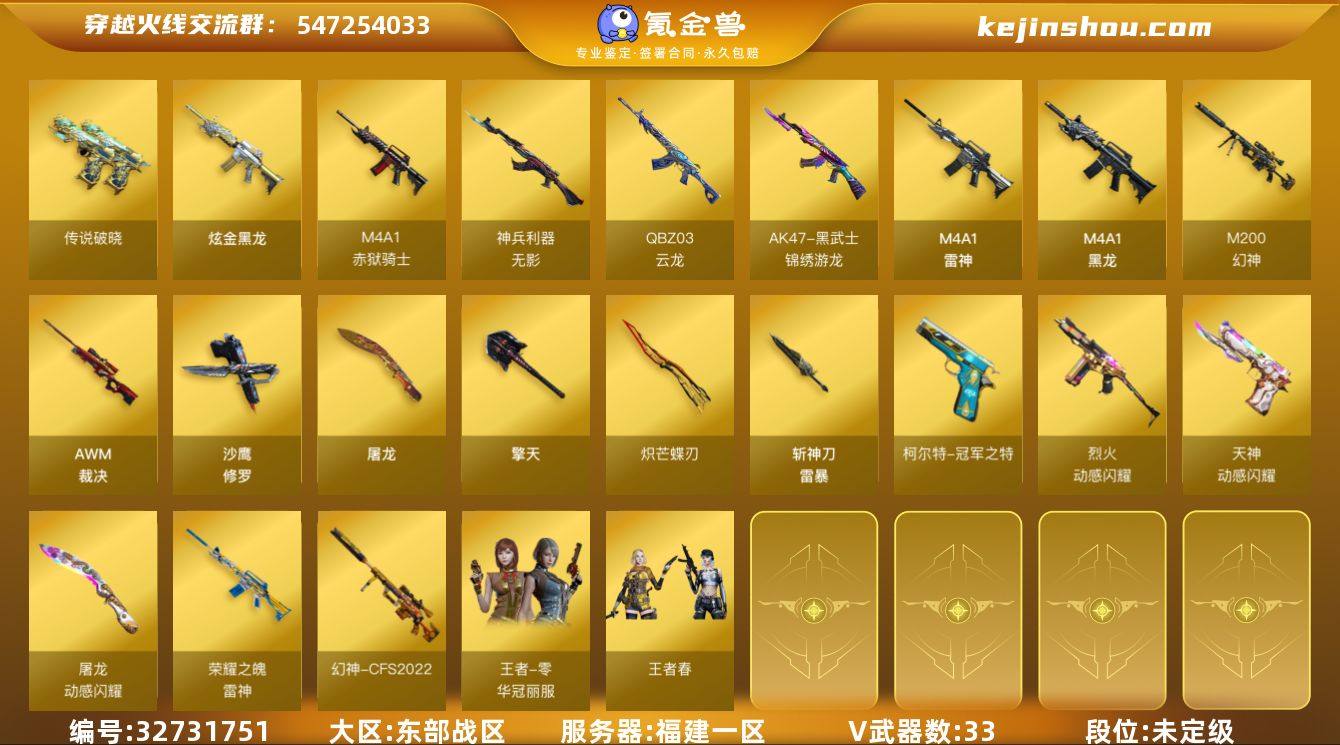福建一区-33V-6王者-1炫金 【传说武器】:传说破晓 【热门武器】:传说破晓,M200-幻神,柯尔特-冠军之特,COP-白鲨,沙鹰-修罗,炽芒蝶刃,炽芒蝶刃-冠军炽芒皮肤 【王者炫金武器】:炫金黑龙 【皮肤】:幻神-宠儿-2021MVP,幻神-CFS2022,幻神-星火小队签名臻藏版 皮肤,白虎-AG-CFPLS20冠军,雷神-荣耀之魄,雷神-宇航兔皮肤,雷神-CFS十周年纪念版 皮肤,屠龙-星火燎原,麒麟刺-甜蜜糖果 皮肤,炽芒蝶刃-冠军炽芒皮肤 【角色】:王者零-华冠丽服,王者春,乔伊教练,暗夜-X,北极狐-X,飞虎队-X,嘉年华灵狐,灵狐者-X,曼陀罗-X,潘多拉-X,斯沃特-X,游珑儿 【人偶武器】:COP-白鲨,AWM-灵狐-15周年嘉年华,迷你波特博士,夺魂,深渊终结者手雷 【暴走生化】:超级对讲机 【挑战大师】:冰龙粉碎者-白马银枪,激光毁灭者III-白马银枪,神圣爆裂者-末日III 【英雄级武器】:M4A1-黑龙,M4A1-雷神,无影-神兵利器,QBZ03-云龙,黑武士-锦绣游龙,烈火-动感闪耀,AWM-裁决,M200-幻神,沙鹰-修罗,柯尔特-冠军之特,天神-动感闪耀,屠龙,擎天,炽芒蝶刃,屠龙-动感闪耀,斩神刀-雷暴,高爆手雷-雷霆,高爆手雷-雷暴,高爆手雷-幻灵*2,手雷-动感闪耀,高爆手雷-云龙,闪...