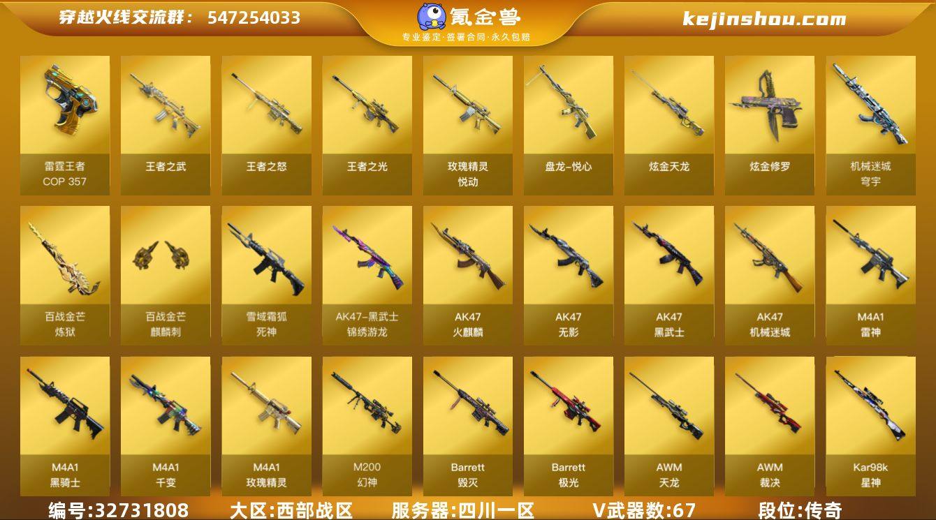 四川一区-71V-13王者武器数-2炫金武器数 【热门武器】:QBZ03-金色蔷薇,M200-幻神,Kar98K-星神,金色小号,C.A.T,M4A1-黑骑士*6,汤姆逊-烈龙*3,RPK-盘龙*2,加特林-炼狱*5,雷神-小红,COP 357-雷霆王者,沙鹰-修罗*3,炽芒蝶刃 【王者炫金武器】:王者之武,玫瑰精灵-悦动*3,王者之光,王者之怒,盘龙-悦心*2,COP 357-雷霆王者,高爆手雷-雷霆王者,炫金天龙,炫金修罗 【音效卡】:屠龙-动感闪耀 音效卡,天神-动感闪耀 音效卡,烈火-动感闪耀 音效卡,AK47-火麒麟音效卡,M4A1-黑骑士音效卡,Barrett-毁灭音效卡,QBZ03-金色蔷薇音效卡,Kar98K-星神音效卡,Barrett-碧霄极光音效卡,炼狱-百战金芒-庆典舞曲音效卡,死神-雪域霜狐-怀旧音效卡,M4A1-雷神-怀旧音效卡,AWM-昌龙-怀旧音效卡,AK47-火麒麟-怀旧音效卡 【皮肤】:幻神-星耀 皮肤,白虎-百战金芒 皮肤,雷神-暗月,雷神-星空,M4A1-再燃火线,火麒麟-雷神,毁灭-暗月,毁灭-百城浙江 皮肤,毁灭-英雄计划 皮肤,M4A1-千变-孔明皮肤,黑骑士-暗月,无影-暗月,无影-能量核心*2,天启-暗月,玫瑰精灵-蓝调梦幻 皮肤,天龙-秘银,炼狱-星空,修罗-能量核心*3,天神-暗月*2,屠龙-星耀 皮肤,轻型军用手斧-再...