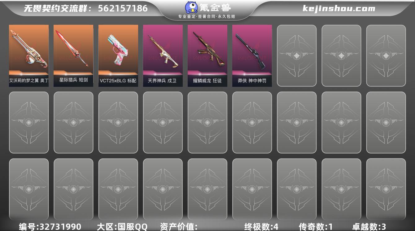 【英雄】:炼狱,暮蝶,钛狐,壹决,铁臂,捷风,幽影,不死鸟,贤者,猎枭,芮娜,尚勃勒,霓虹,K/O,盖可,钢锁 【近战武器】:近战武器-碎心裂刃,近战武器-剥皮小刀,近战武器-星际猎兵 短剑 【狂徒】:狂徒-耀鳞威龙 【戍卫】:戍卫-天界神兵 【莽侠】:莽侠-神中神罚 【奥丁】:奥丁-艾沃莉的梦之翼 【判官】:判官-炽红快攻 【VCT手枪】:标配-VCT25 x BLG 【卡面】:无畏契约GO!第一卷:零 卡面,钢锁vs盖可 卡面,代号红色 卡面,新兵报到 卡面,V契约 卡面,无畏契约 卡面 【喷漆】:红鳞 喷漆,暴走萝莉 喷漆,胜利属于无畏契约 喷漆,GLHF 喷漆,无畏契约 喷漆 【挂饰】:无畏契约 纪念币 挂饰