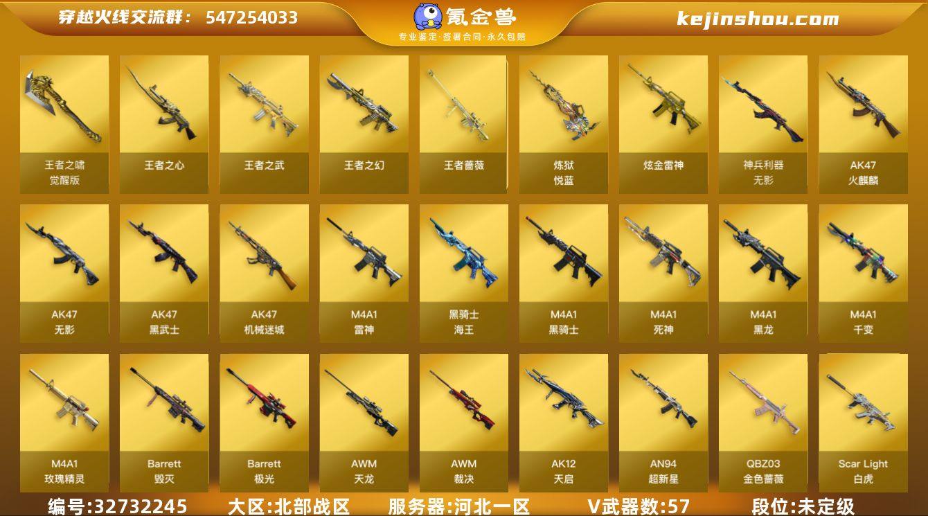 河北一区-62V-7王者武器数-2炫金武器数 【热门武器】:QBZ03-金色蔷薇,Scar Light-白虎,M200-竞技荣光,死亡之眼*2,Kar98K-星神,M4A1-黑骑士,汤姆逊-烈龙,RPK-盘龙,加特林-炼狱*3,沙鹰-修罗*2,荣耀世冠-龙啸 【王者炫金武器】:王者之幻,王者之武,王者之心,王者蔷薇,炼狱-悦蓝,炫金雷神,炫金武士 【音效卡】:M4A1-黑骑士音效卡,Barrett-毁灭音效卡 【皮肤】:雷神-暗月,雷神-能量核心*2,雷神-虎将,雷神-源计划2.0专属 皮肤,火麒麟-轻羽皮肤,火麒麟-平天大圣,火麒麟-心动糖果,毁灭耀金皮肤,毁灭-星空,M4A1-千变-孔明皮肤,黑龙-能量核心,黑龙-暗月,黑骑士-暗月*4,黑骑士耀金皮肤,无影-暗月*9,无影-能量核心,死神-秘银*4,天启-暗月*6,战神-粉色甜心皮肤,战神-流金岁月皮肤,AK47-B-常胜将军-曹操*2,AK47-B-常胜将军-刘备,AK47-B-常胜将军-孙权,天龙-秘银,天龙-能量核心,极光-能量核心,炼狱-星空,修罗-能量核心,天神-暗月*3 【角色】:葵,战地猎狐,王者-瞳-闭月羞花,王者之瞳,王者玲珑-小乔,狐影,乔伊教练,修道士,云海玲珑,飞虎队-X,嘉年华灵狐,灵狐者-职业经理,龙儿-小淘气,斯沃特-X,樱-青春偶像,影武者-X 【人偶武...
