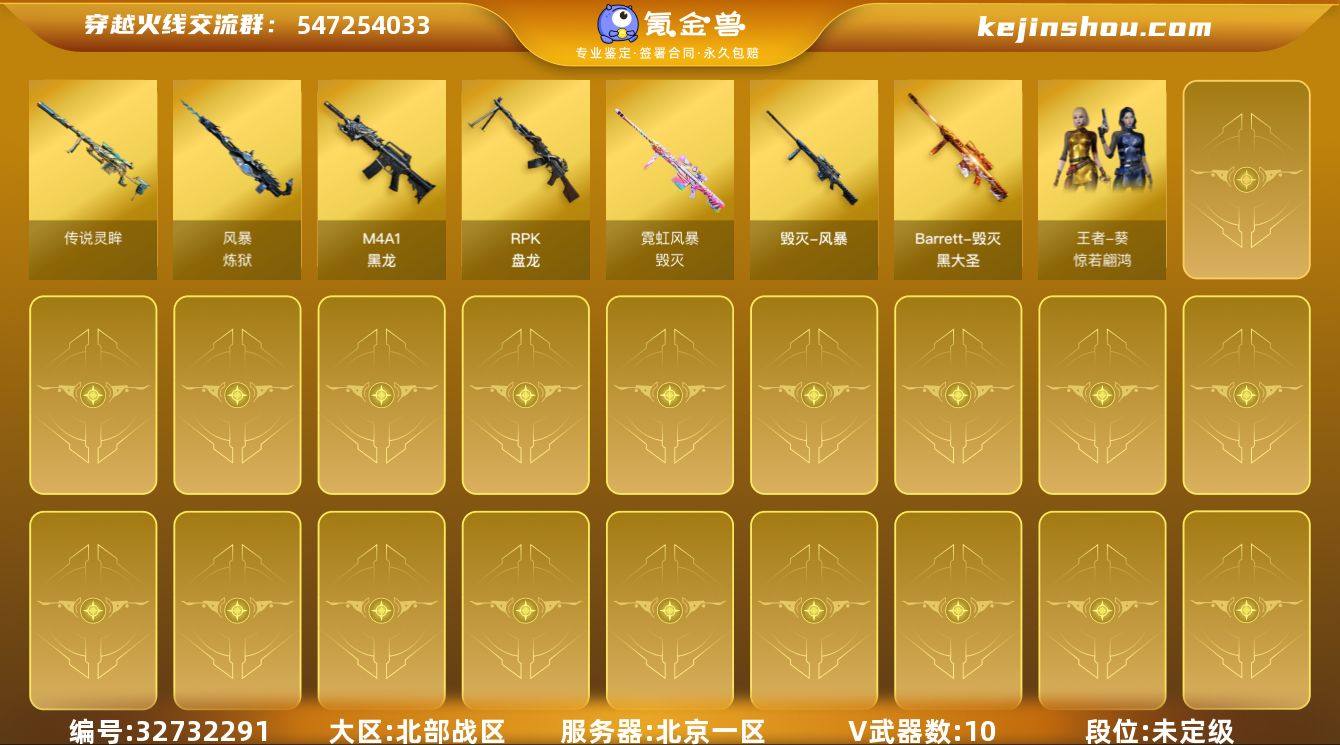 北京一区-12V-1王者-0炫金 【传说武器】:传说灵眸 【热门武器】:传说灵眸,死亡之眼,RPK-盘龙*3 【音效卡】:死神-雪域霜狐-怀旧音效卡 【皮肤】:毁灭-黑大圣皮肤,毁灭-风暴,轻型军用手斧-再燃火线 【角色】:王者葵-惊若翩鸿,雪域霜狐,修道士,风暴女,灵狐-花神,灵狐者-X,龙儿-小淘气,麻雀,潘多拉-甜心教官 【人偶武器】:迷你裂空之翼,迷你生化手雷*2 【暴走生化】:死亡之眼,超级对讲机 【英雄级武器】:M4A1-黑龙,死神-雪域霜狐,QBZ03-独角-III,RPK-盘龙*3,炼狱-风暴 【道具】:CFS限定背包,云山科技背包,裂空之翼背包-金色,超级背包,雪域霜狐炫彩背包,救世主-黑桃战神,绿色巨人,变异宝贝,夺命之镰,防化服*2,语音特效-怀旧,雪域霜狐表情,防弹头盔*4,防弹衣*4,C4工具钳*4,手雷包*4 【特殊枪械】:3盘龙
