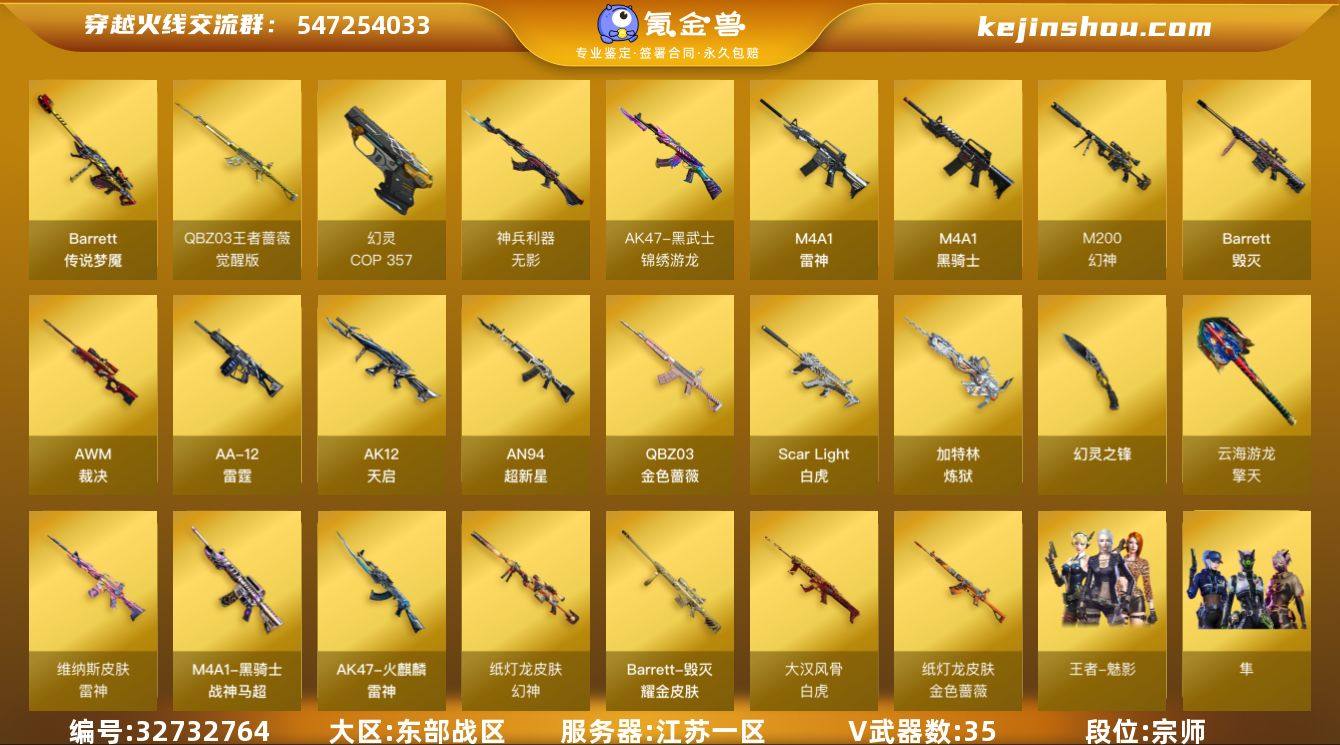 江苏一区-36V-2王者-0炫金 【传说武器】:传说梦魇 【传说角色】:传说星骇 【热门武器】:传说梦魇,QBZ03-金色蔷薇,Scar Light-白虎,M200-幻神,M4A1-黑骑士,加特林-炼狱,COP 357-幻灵 【王者炫金武器】:王者冰锋 【音效卡】:Barrett-极光音效卡,AWM-裁决音效卡 【皮肤】:幻神-纸灯龙皮肤,白虎-大汉风骨,金色蔷薇-纸灯龙皮肤,裁决-叶芒苍灵 皮肤,星神-璀璨皮肤,雷神-维纳斯皮肤,火麒麟-雷神*2,毁灭耀金皮肤,黑骑士-战神马超 【角色】:隼,王者-魅影,云海玲珑,暗夜-X,初恋灵狐,电竞少女,风暴女,嘉年华灵狐,兰-空鹰,猎狐者-追月,灵狐者-X,麻雀,潘多拉-X,青霞仙子,蜀雪,维纳斯,新娜塔莎,夜玫瑰-宠粉,影武者-X,游珑儿 【人偶武器】:白虎-迷你小艾,AWM-灵狐-15周年嘉年华,迷你牛牛,灵狐娃娃手雷 【暴走生化】:黑龙吞噬者 【挑战大师】:冰龙粉碎者-白马银枪,激光毁灭者III-白马银枪 【英雄级武器】:M4A1-雷神,M4A1-黑骑士,AK12-天启,AN94-超新星,Scar Light-白虎,无影-神兵利器,黑武士-锦绣游龙,QBZ03-金色蔷薇,QBZ-03-王者蔷薇-觉醒版,Barrett-毁灭,AWM-裁决,M200-幻神,加特林-炼狱,AA-12-雷霆,COP 357-幻灵,幻灵之锋...