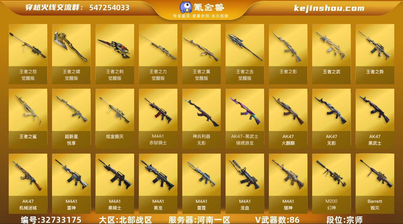 【941996】河南一区-94V-12王者武器数-1炫金武器数 【热门武器】:QBZ03-金色蔷薇,M4A1-青龙,M200-幻神,M4A1-黑骑士*4,汤姆逊-烈龙*2,RPK-盘龙,加特林-炼狱*2,降世魔童,沙鹰-修罗*2 【王者炫金武器】:王者之鲨,超新星-悦享,王者之势,王者之武,王者之影,炫金毁灭 【音效卡】:AK47-火麒麟音效卡,M4A1-雷神音效卡,M4A1-黑龙音效卡,M4A1-黑骑士音效卡,Barrett-毁灭音效卡,Barrett-极光音效卡 【皮肤】:雷神-暗月,雷神-荣耀之魄,雷神-星空,火麒麟-冠军之心,AK47-火麒麟-传奇EVEN,火麒麟-轻羽皮肤,毁灭-荣耀之怒,毁灭耀金皮肤,毁灭-冠军之怒,黑龙-暗月,黑骑士-暗月,黑骑士耀金皮肤,无影-能量核心,无影耀金皮肤,战神-粉色甜心皮肤*2,战神-紫绶金章皮肤*2,战神-流金岁月皮肤,AWM-天龙-传奇70KG*2,AWM-天龙-传奇白鲨,极光-能量核心*2,修罗-星空,修罗-冠军之魂 【角色】:炫,王者之瞳,乔伊教练,飞虎队-X,娟娟,兰-海滩派对,兰-新年限定,猎狐者-追月,零-水下丽影,龙儿,萌儿,潘多拉-X,铁骑-乘风破浪,王者-零-传说之路,维纳斯,新灵狐者,新娜塔莎,樱-战斗天使,樱-缤纷夏日,游珑儿 【人偶武器】:天龙-曼陀罗,M4A1-雷神-精英刀...