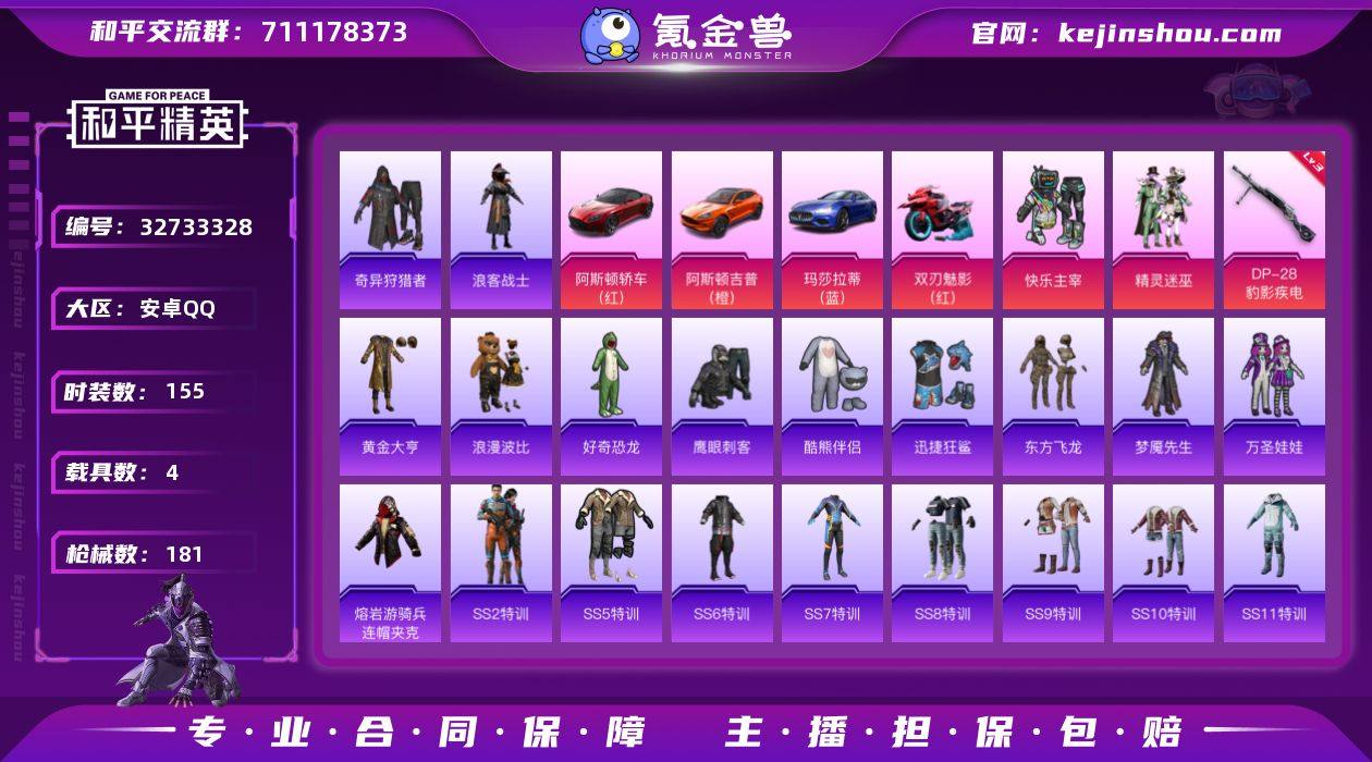 【941999】安卓【小号 套装-SS1特训,Mk14-福马献瑞(五级),阿斯顿马丁DBS(红),阿斯顿马丁DBX(橙),玛莎拉蒂Ghibli(蓝),双人摩托-双刃魅影(红),百万伏特背包(3级)】 手Q-2粉装-2特效枪-4载具-0粉色飞行器-58400热力值-4王牌印记-155套装-181枪皮 【热门品类】:套装-奇异狩猎者,套装-黄金大亨,套装-浪客战士,套装-SS1特训,套装-浪漫波比,熔岩游骑兵连帽夹克 【粉色套装】:粉装-快乐主宰,粉装-精灵迷巫 【粉色枪皮等级】:Mk14-福马献瑞(五级),DP-28-豹影疾电(三级) 【粉色载具】:阿斯顿马丁DBS(红),阿斯顿马丁DBX(橙),玛莎拉蒂Ghibli(蓝),双人摩托-双刃魅影(红) 【粉色枪皮】:Mk14-福马献瑞,DP-28-豹影疾电 【粉色降落伞】:深海曼妙降落伞,快乐主宰降落伞,甜心宝贝降落伞,炫紫旋律降落伞,心之恋语降落伞,潮汐统领降落伞,诡面斩降落伞,王牌四分卫降落伞,星之彼岸降落伞,怪笑疯兔降落伞 【稀有套装】:套装-马上有钱,套装-雨过天青,套装-红釉青花 【稀有枪皮】:AKM-四圣焕新,AKM-夜灯,AKM-奇异狩猎者,AKM-星之彼岸,AKM-生命誓言,AKM-百万伏特,AKM-破晓战魂,AKM-缤纷海域,AKM-萌趣颜团子,M16A4-快乐主宰,M16A4-红色方程...