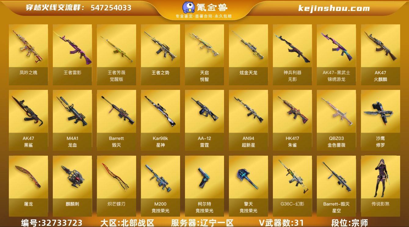 【ky6475】辽宁一区-34V-5王者武器数-1炫金武器数 【传说角色】:传说影煞 【热门武器】:G36C-幻影,QBZ03-金色蔷薇,HK417-朱雀,M200-竞技荣光,凤吟之魄,Kar98K-星神,沙鹰-修罗*2,炽芒蝶刃 【王者炫金武器】:天启-悦智,王者之势,凤吟之魄,王者雷影,炫金天龙 【音效卡】:HK417-朱雀音效卡 【皮肤】:毁灭-星空 【角色】:关小雨,风暴女,嘉年华灵狐,灵动武士,灵狐者-X,曼陀罗-X,斯沃特-X,幽,团团 【人偶武器】:AWM-灵狐-15周年嘉年华 【英雄级武器】:AK47-火麒麟,AN94-超新星,AK47-黑鲨*2,M4A1-龙血,HK417-朱雀,无影-神兵利器,G36C-幻影,黑武士-锦绣游龙,QBZ03-金色蔷薇,王者芳薇-觉醒版,Barrett-毁灭,Kar98K-星神,M200-竞技荣光,Barrett-金色蔷薇,AA-12-雷霆,沙鹰-修罗*2,柯尔特-竞技荣光,屠龙,麒麟刺*2,擎天-竞技荣光*2,炽芒蝶刃,高爆手雷-竞技荣光*2,闪光弹-竞技荣光*3,烟雾弹-竞技荣光*2,M4A1-赤狱骑士 【源级武器】:源·雷神,魂·M4A1-雷神-化蛇,御·黑骑士·哪吒闹海,QBZ03-文殊坊,魂·9A91·烈火-电子连击,AWM-裁决-百城联赛天津,魂·裁决-羽掣,灵·Barrett-朱雀-炫光,魂·炼狱-月,魂·修罗-15周年嘉年华,魂·天神-阿努...