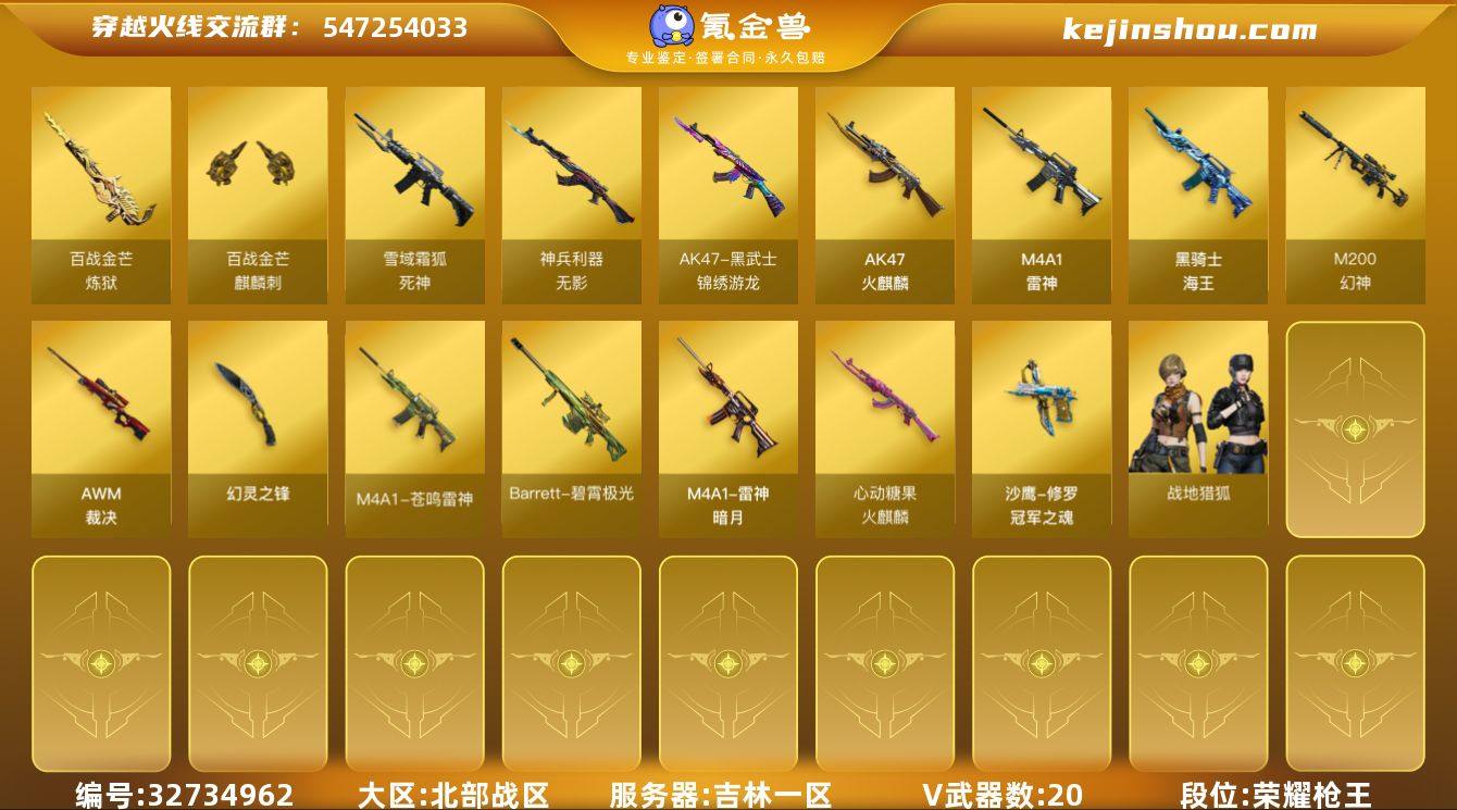吉林一区-23V-0王者-0炫金 【热门武器】:M200-幻神 【音效卡】:炼狱-百战金芒-庆典舞曲音效卡,死神-雪域霜狐-怀旧音效卡 【皮肤】:幻神-电竞之星 皮肤,雷神-暗月,雷神-诺拉 皮肤,M4A1-再燃火线,雷神-神秘按键 皮肤,火麒麟-心动糖果,修罗-冠军之魂,轻型军用手斧-再燃火线 【角色】:战地猎狐,雪域霜狐,乔伊教练,修道士,云海玲珑,暗夜-X,虎妞,嘉年华灵狐,零-水下丽影,灵狐者-X,潘多拉-X,青霞仙子,斯沃特-X,新娜塔莎 【暴走生化】:超级对讲机 【英雄级武器】:AK47-火麒麟,M4A1-雷神,无影-神兵利器,黑武士-锦绣游龙,死神-雪域霜狐,黑骑士-海王,AWM-裁决,M200-幻神,炼狱-百战金芒,幻灵之锋,麒麟刺-百战金芒,高爆手雷-幻灵,闪光弹-幻灵,烟雾弹-幻灵,M4A1-赤狱骑士,M4A1-苍鸣雷神,Barrett-碧霄极光 【道具】:BS战队炫彩背包,云山科技背包,百战金芒炫彩背包,背包-洛丽塔,超级背包,雪域霜狐炫彩背包,女皇终结者-魔龙之吻,救世主-黑桃战神,黄金生化钩,绿色巨人,灵魂忍者*2,变异宝贝,迷雾幽灵*2,夺命之镰,防化服*3,金色流光-枪王排位*2,星辰流光-枪王排位,流光-鎏金之域,枪王排位28赛季金色流光,枪王排位29赛季金色流光,...