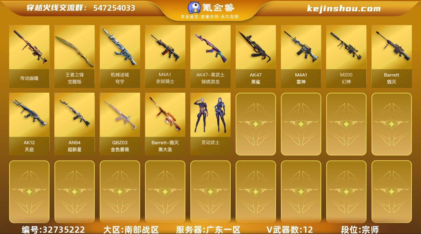 广东一区-15V-3王者武器数-0炫金武器数 【传说武器】:传说幽瞳 【热门武器】:传说幽瞳,QBZ03-金色蔷薇,M4A1-青龙,M200-幻神 【皮肤】:裁决-胜者为王 皮肤,毁灭-黑大圣皮肤,毁灭-英雄计划 皮肤 【角色】:蛇隐宗,乔伊教练,云海玲珑,暗夜-X,风暴女,猎狐者-追月,0号玩家,灵动武士,灵狐者-X,灵狐者-七夕宝贝,潘多拉-X,潘多拉-甜心教官,蛇姬,兔囡囡,新娜塔莎,樱-战斗天使 【挑战大师】:冰龙粉碎者-白马银枪,激光毁灭者III*2 【英雄级武器】:M4A1-雷神,AK12-天启,AN94-超新星,AK47-黑鲨,M4A1-青龙,黑武士-锦绣游龙,QBZ03-金色蔷薇,机械迷城-穹宇,Barrett-毁灭,M200-幻神,王者之锋-觉醒版,高爆手雷-幻灵,高爆手雷-古蛇迷踪,闪光弹-雷霆王者-觉醒版*2,烟雾弹-古蛇迷踪,M4A1-赤狱骑士,AK47-竞魂无影 【源级武器】:源·火麒麟,源-黑龙,御·黑龙-龙太子,源·雷神*2,魂·M4A1-雷神-化蛇*2,魂·雷神-诺拉,魂·雷神-新春神龙,魂·雷神-萌柴,御·雷神-小白龙,魂·黑骑士-破浪10年,魂·黑骑士-娜塔莉娅,御·黑骑士-冰魄,源·机械迷城,魂·龙血-锋芒破茧,M4A1-青龙-掌上穿越火线,魂·HK417-朱雀-凤灵*2,源·HK417-朱雀,金色蔷薇-狼王,魂·QBZ03-...