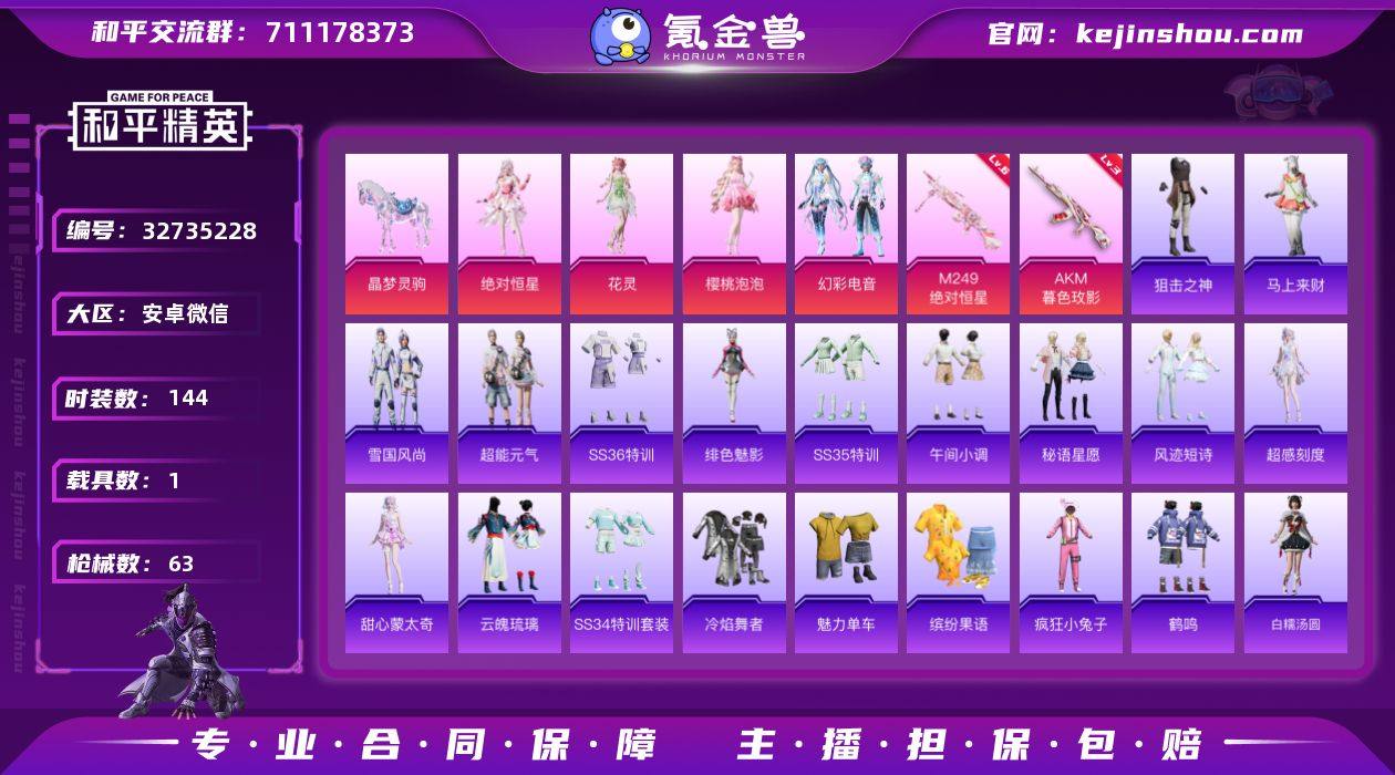 实名: 可修改 时装数: 144 载具数: 1 枪械数: 63 战备数: 1 热门装扮: 樱桃泡泡,幻彩电音,花灵,绝对恒星 载具: 晶梦灵驹 稀有枪皮: M249-绝对恒星,AKM-暮色玫影