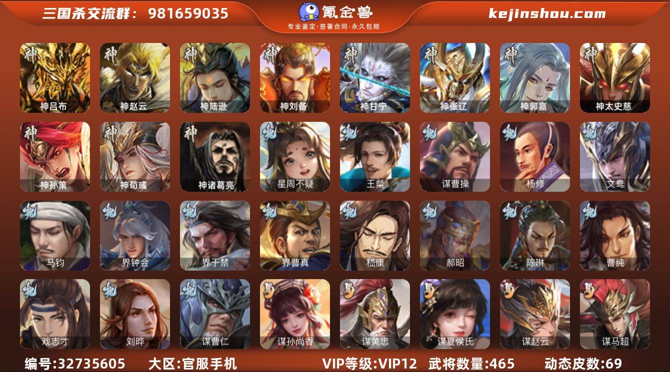 标题:S36863 VIP等级:VIP12 官阶:大将军 史诗武将数量:79 动态皮肤数量:69 史诗宝珠数量:14 将魂数量:13664 雁翎数量:34930 心愿积分:7288 史诗武将(魏国):文鸯,马钧,界钟会,戏志才,势辛宪英,清河公主,司马昭,谋曹仁,星周不疑,谋曹操,界曹真,嵇康,杨修,陈琳,刘晔,王粲,界于禁,程昱,曹纯,郝昭 史诗武将(蜀国):势魏延,谋黄忠,谋孙尚香,谋赵云,谋夏侯氏,沙摩柯,周群,花鬟,谯周,张星彩,王平,诸葛瞻,界黄忠,马云禄,董允,赵襄,谋马超 史诗武将(吴国):谋黄盖,孙寒华,界徐盛,留赞,骆统,谋孙策,周处,界步练师,界朱然,吴景,贺齐,文鸯,谋孙尚香 史诗武将(群雄):刘焉,星董卓,杜预,界左慈,祢衡,许攸,麹义,司马昭,谋张角,星甘宁,郑玄,界李儒,星黄忠,张让,审配,卑弥呼,左慈,兀突骨,沮授,陶谦,苏飞,公孙康 史诗武将(神将):神郭嘉,神荀彧,神甘宁,神孙策,神太史慈,神赵云,神陆逊,神吕布,神张辽,神刘备