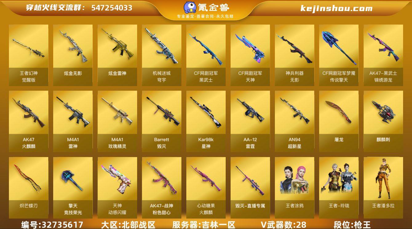 吉林一区-31V-1王者武器数-2炫金武器数 【热门武器】:Kar98K-星神,炽芒蝶刃 【王者炫金武器】:炫金无影,炫金雷神 【音效卡】:天神-动感闪耀 音效卡 【皮肤】:雷神-荣耀之魄,火麒麟-心动糖果,毁灭-直播专属,毁灭-英雄计划 皮肤,战神-粉色甜心皮肤 【角色】:战地猎狐,王者涂鸦,王者玲珑,王者潘多拉,奇洋探员,乔伊教练,修道士,云海玲珑,幻面灵狐,芳心审判者,风暴女,娟娟,龙儿,女主播,潘多拉-X,潘多拉-甜心教官,兔囡囡,新灵狐者,团团 【人偶武器】:迷你牛牛 【英雄级武器】:AK47-火麒麟,M4A1-雷神,AN94-超新星,QBZ03-天罚,无影-神兵利器,黑武士-锦绣游龙,M4A1-玫瑰精灵,黑武士-CF网剧冠军,HK417-朱雀-电竞之星,机械迷城-穹宇,Barrett-毁灭,Kar98K-星神,王者幻神-觉醒版,AA-12-雷霆,天神-动感闪耀,天神-CF网剧冠军,屠龙,麒麟刺,擎天-竞技荣光*2,炽芒蝶刃,擎天-CF网剧冠军,屠龙-电竞之星,高爆手雷-竞技荣光,手雷-动感闪耀,闪光弹-竞技荣光*2,烟雾弹-竞技荣光,AK47-竞魂无影,AN94-竞魂超新星 【源级武器】:源·火麒麟*2,魂·火麒麟-百城*2,御·火麒麟-平天大圣*2,源·雷神,魂·M4A1-雷神-化蛇,魂·雷神-神秘按键,魂·雷神...