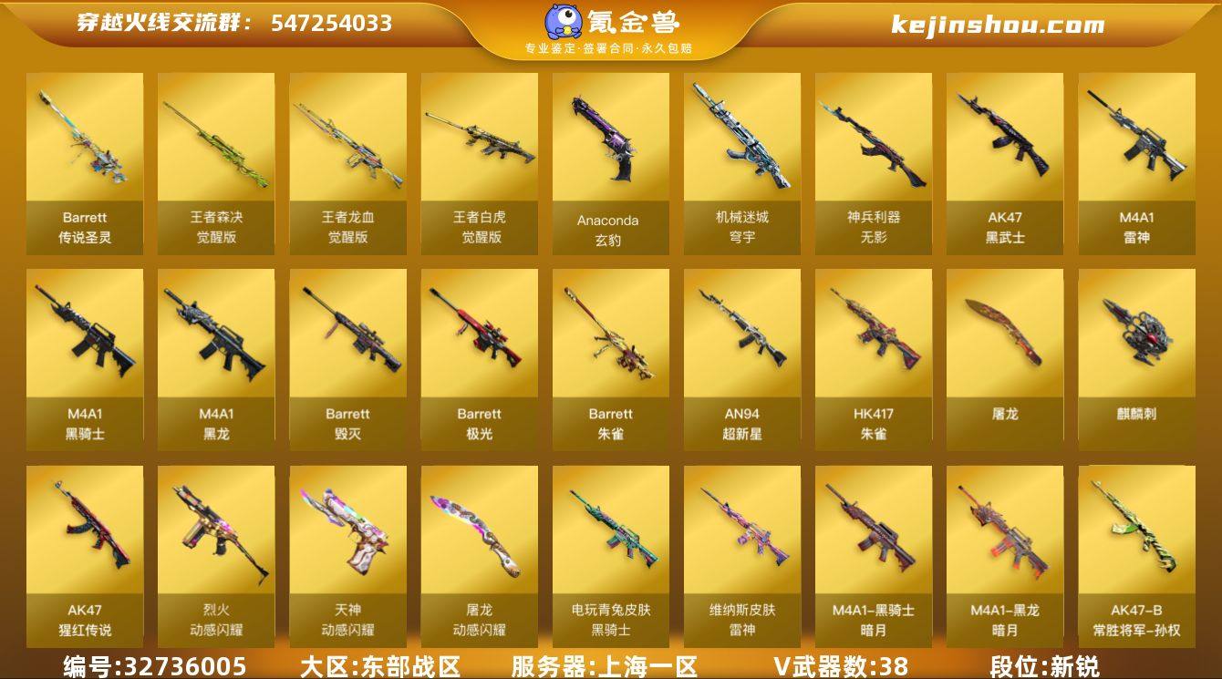 上海一区-43V-4王者武器数-0炫金武器数 【传说武器】:传说圣灵 【热门武器】:传说圣灵,HK417-朱雀,M4A1-青龙,M4A1-黑骑士 【王者炫金武器】:王者冰锋 【音效卡】:M4A1-黑龙音效卡,M4A1-黑骑士音效卡 【皮肤】:雷神-维纳斯皮肤,雷神-源计划2.0专属 皮肤,毁灭-英雄计划 皮肤,黑龙-暗月,黑骑士-暗月,黑骑士-电玩青兔皮肤,战神-流金岁月皮肤,AK47-B-常胜将军-孙权 【角色】:晴雅,王者炽天使,蛇隐宗,乔伊教练,暗夜-X,风暴女,灵狐-花神,灵狐者-X,麻雀,蛇姬,王者-零-传说之路,维纳斯,雪莉杨-摸金校尉 【人偶武器】:迷你火种,迷你超能女侍 【暴走生化】:超级对讲机 【挑战大师】:试炼破坏者III 【英雄级武器】:M4A1-黑龙,M4A1-雷神,M4A1-黑骑士,AK47-黑武士,AN94-超新星,M4A1-青龙,HK417-朱雀,无影-神兵利器,烈火-动感闪耀,AK-47-猩红传说,王者白虎-觉醒版,王者龙血-觉醒版,机械迷城-穹宇,Barrett-毁灭,Barrett-极光,Barrett-朱雀,王者森决-觉醒版,Anaconda-玄豹,天神-动感闪耀,屠龙,麒麟刺,屠龙-动感闪耀,丛林匕首-玄豹,王者冰锋-觉醒版,手雷-动感闪耀,高爆手雷-古蛇迷踪,高爆手雷-玄豹*3,闪光弹-玄豹*3,烟雾弹-玄豹*...