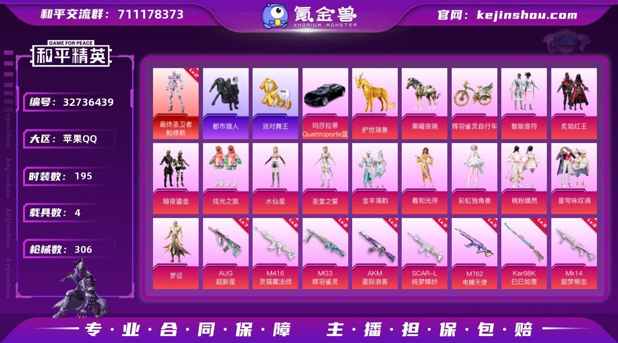 苹果 手Q-1神装-15粉装-18特效枪-4载具-16粉色飞行器-115105热力值-13王牌印记-195套装-306枪皮 【红色神装等级】:最终圣卫者-帕修斯(二级) 【红色角色神装】:最终圣卫者-帕修斯 【热门品类】:套装-浪漫天命,套装-都市猎人,套装-派对舞王,角色-军刀雅典娜,套装-金羽特工,套装-龟仙人,套装-红红火火,角色-Mark.06 【粉色套装】:粉装-智能音符,粉装-炙焰红王,粉装-暗夜鎏金,粉装-炫光之旅,角色-水仙星,角色-圣堂之誓,粉装-金丰海韵,角色-羲和光序,角色-彩虹独角兽,粉装-桃粉嫣然,粉装-星穹咏叹调,角色-罗征,角色-镜中幻,角色-月中灵,角色-旋星之夜 【粉色枪皮等级】:AKM-星际浪客(五级),SCAR-L-纯梦嫁纱(五级),M416-风花雪月(一级),M416-墨龙九天(一级),M416-灵猫魔法师(六级),GROZA-旋星之夜(三级),AUG-超新星(七级),M762-电糖天使(五级),UMP45-萌骑冒险(二级),Vector-最终圣卫者(三级),AKS-74U-星穹咏叹调(二级),Kar98K-巳巳如意(五级),Mk14-盛世惊鸿(三级),Mk14-甜梦熊击(五级),Mk14-福马献瑞(五级),AMR-智耀战神(四级),MG3-辉羽雀灵(六级),破片手榴弹-招财进宝(五级) 【粉色载具】:玛莎拉蒂Quattroporte(夜幕蓝),护世瑞兽,...