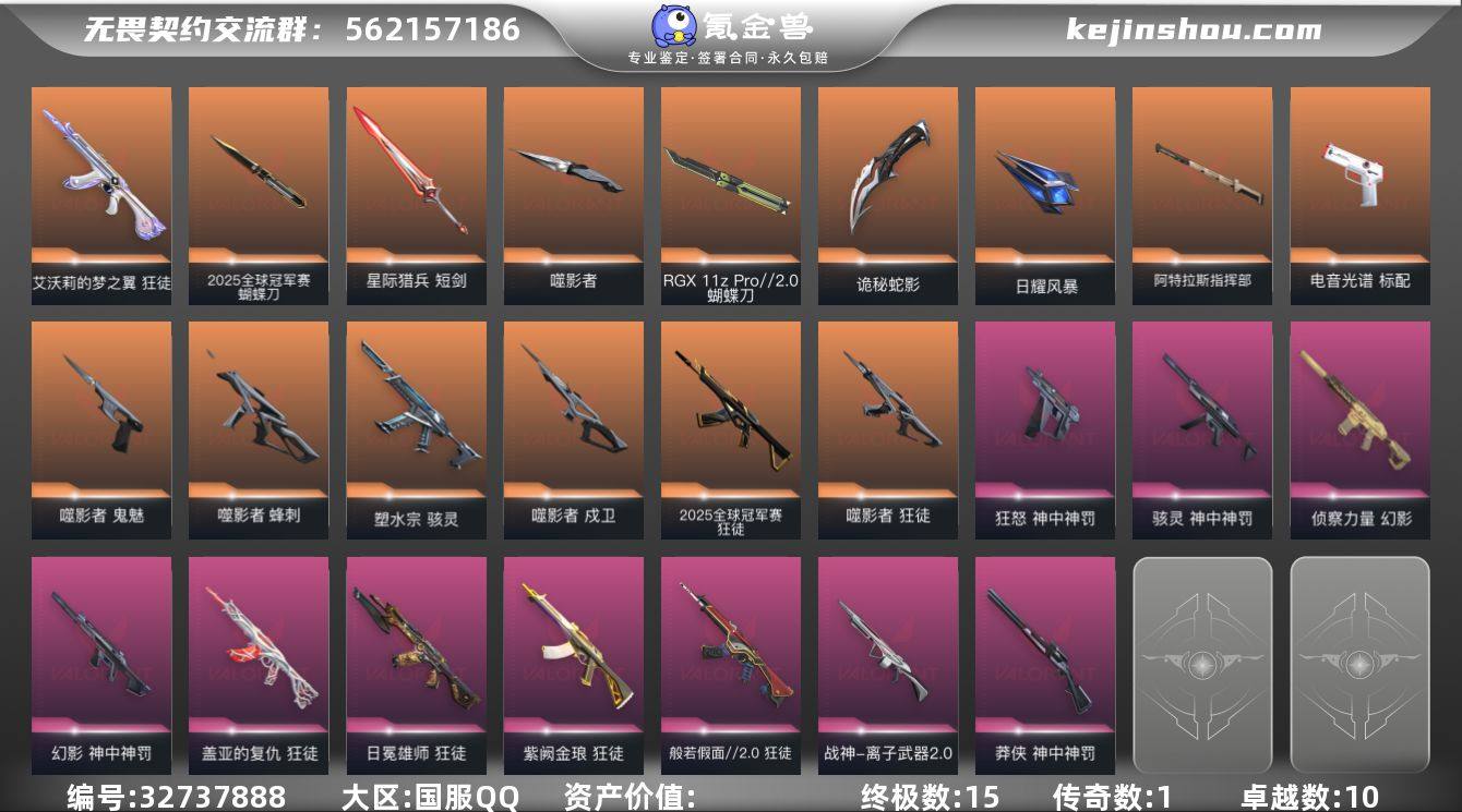 【套装】:2025全球冠军赛套装,噬影者套装,神中神罚套装 【英雄】:幻棱,炼狱,维斯,暮蝶,壹决,铁臂,捷风,雷兹,幽影,不死鸟,贤者,猎枭,蝰蛇,零,芮娜,奇乐,尚勃勒,霓虹,夜露,K/O,盖可,黑梦,钢锁 【近战武器】:近战武器-2025全球冠军赛 蝴蝶刀,近战武器-神之刃,近战武器-RGX 11z Pro//2.0 蝴蝶刀,近战武器-噬影者 簇刃,近战武器-诡秘蛇影 军刀,近战武器-日耀风暴 遗器,近战武器-阿特拉斯指挥部 甩棍,近战武器-星际猎兵 短剑 【狂徒】:狂徒-2025全球冠军赛,狂徒-噬影者,狂徒-艾沃莉的梦之翼,狂徒-般若假面//2.0,狂徒-盖亚的复仇,狂徒-日冕雄师,狂徒-紫阙金琅,狂徒-诡秘蛇影 【幻影】:幻影-侦察力量,幻影-神中神罚,幻影-末日之翼 【戍卫】:戍卫-噬影者,戍卫-折光棱晶 【飞将】:飞将-末日之翼 【莽侠】:莽侠-神中神罚,莽侠-诡秘蛇影 【战神】:战神-离子武器//2.0 【奥丁】:奥丁-末日之翼 【判官】:判官-诡秘蛇影 【骇灵】:骇灵-塑水宗,骇灵-神中神罚,骇灵-无限竞技 【蜂刺】:蜂刺-噬影者,蜂刺-折光棱晶 【标配】:标配-电音光谱,标配-折光棱晶,标配-电音光谱 【鬼魅】:鬼魅-噬影者,鬼魅-诡秘蛇影 【狂怒】:狂怒-神中...