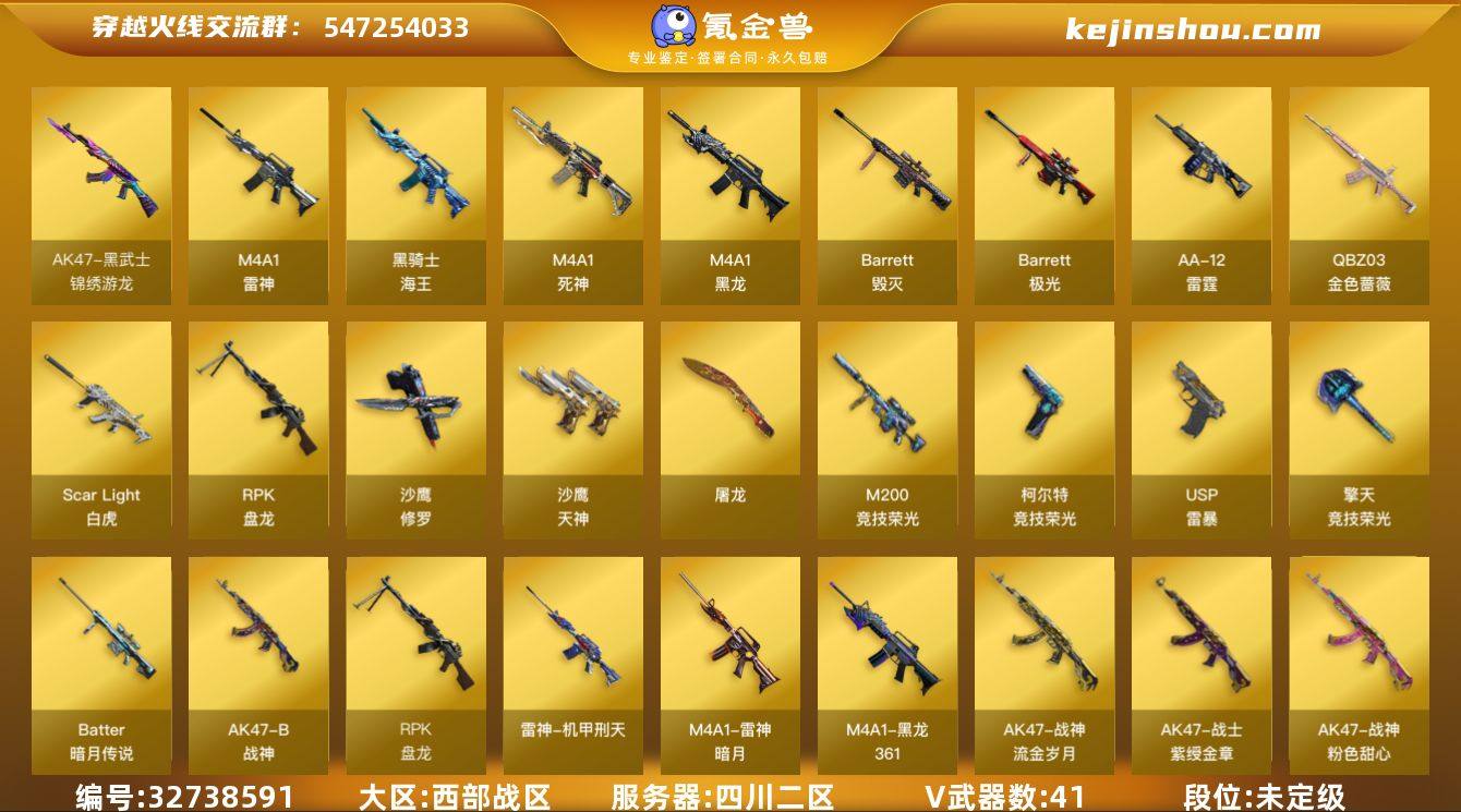 四川二区-54V-4王者武器数-1炫金武器数 【热门武器】:QBZ03-金色蔷薇,Scar Light-白虎,M200-竞技荣光,RPK-盘龙,火麒麟-绝迹,USP-雷暴,沙鹰-修罗 【王者炫金武器】:炫金骑士 【音效卡】:Barrett-毁灭音效卡,Scar Light-白虎音效卡,炼狱-百战金芒-庆典舞曲音效卡 【皮肤】:幻神-电竞之星 皮肤,白虎-百战金芒 皮肤,金色蔷薇-电竞之星 皮肤,雷神-暗月,雷神-机甲刑天皮肤,雷神-海滩派对 皮肤,M4A1-再燃火线,雷神-蓝风铃 皮肤,火麒麟-平天大圣,毁灭-荣耀之怒,毁灭-AG-CFPLS15冠军,毁灭-航天科技皮肤,毁灭-英雄计划 皮肤,M4A1-黑龙-361,无影-华夏传说 皮肤,战神-粉色甜心皮肤,战神-紫绶金章皮肤,战神-流金岁月皮肤*2,修罗-CF STAR,轻型军用手斧-再燃火线 【角色】:樱,电竞教官-云悠悠,鹰,零·纪元,战地猎狐,葵-阿尔法武装,幻面灵狐,空,初恋灵狐,飞虎队-X,兰-海滩派对,灵狐者-职业经理,潘多拉-X,潘多拉-甜心教官,潜龙队-X,蛇姬,斯沃特-X,兔囡囡,雪莉杨-摸金校尉,樱-战斗天使,游珑儿,潘多拉-N,团团 【人偶武器】:火麒麟-绝迹,AWM-灵狐-15周年嘉年华*2,迷你波特博士*3,迷你生化手雷,生化手雷-机甲核心,闪光弹-小乔,灵狐娃...