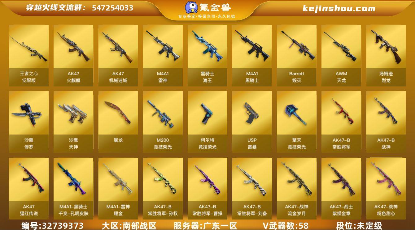 广东一区-59V-1王者-0炫金 【热门武器】:M200-竞技荣光,死亡之眼,M4A1-黑骑士,汤姆逊-烈龙*5,裁决-雪莉杨,USP-雷暴,沙鹰-修罗 【音效卡】:M4A1-雷神音效卡,M4A1-黑骑士音效卡,Barrett-毁灭音效卡 【皮肤】:雷神-耀金皮肤,火麒麟-平天大圣,火麒麟-心动糖果,毁灭-CFS2020,M4A1-千变-孔明皮肤,战神-粉色甜心皮肤,战神-紫绶金章皮肤,战神-流金岁月皮肤,AK47-B-常胜将军-曹操,AK47-B-常胜将军-刘备,AK47-B-常胜将军-孙权 【角色】:电竞教官-云悠悠,王者-瞳-闭月羞花,空,初恋灵狐,芳心审判者,风暴女*2,娟娟,龙儿,龙儿-小淘气,斯沃特-X,新娜塔莎,雪莉杨-摸金校尉 【人偶武器】:裁决-雪莉杨,迷你深渊冰龙,迷你裂空之翼,夺魂,迷你生化手雷,深渊终结者手雷,闪光弹-小乔,闪光弹-貂蝉,高爆手雷-大乔,迷你艾比 【暴走生化】:死亡之眼 【挑战大师】:AK47-冰龙粉碎者,冰龙粉碎者-白马银枪,激光毁灭者III,机甲撕裂者III,神圣爆裂者-末日III,阐释者III 【英雄级武器】:AK47-火麒麟*2,M4A1-雷神*3,M4A1-黑骑士,AK47-机械迷城,王者之心-觉醒版,AK-47-猩红传说,AK47-B-战神,黑骑士-海王,AK47-B-常胜将军,AWM-天龙,Barrett-毁灭,M20...