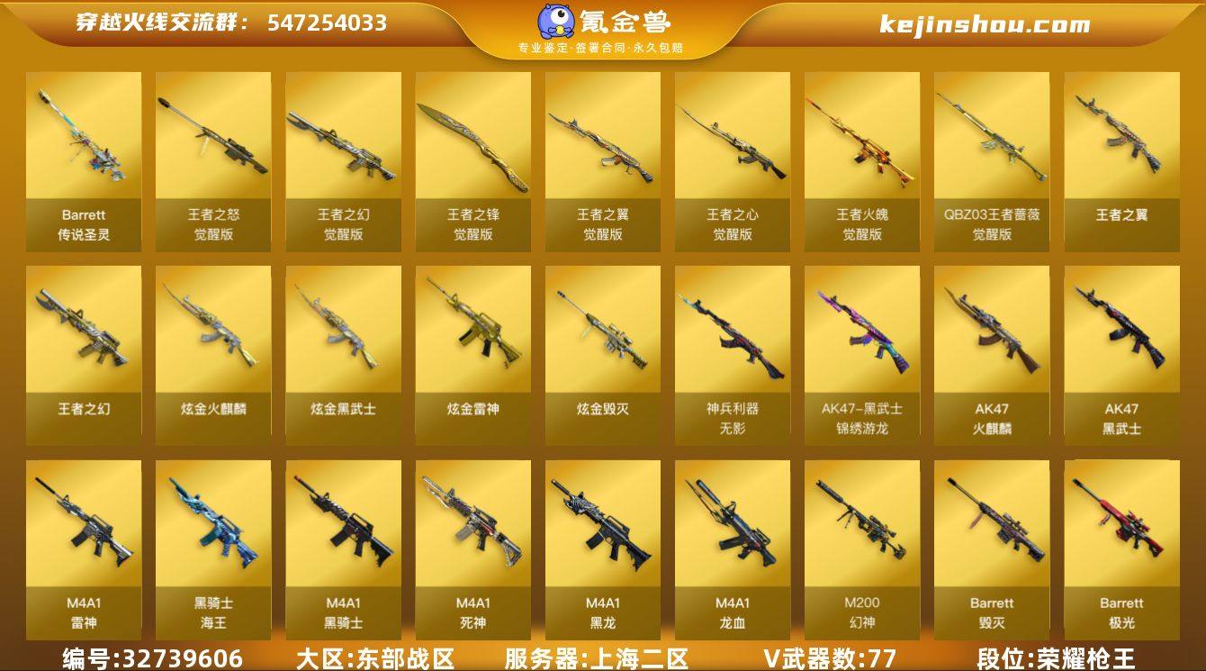 上海二区-93V-10王者武器数-4炫金武器数 【传说武器】:传说圣灵 【热门武器】:传说圣灵,Scar Light-白虎,M200-幻神,死亡之眼,M4A1-黑骑士*2,汤姆逊-烈龙*6,RPK-盘龙*5,加特林-炼狱*3,沙鹰-修罗*3,金刚伞 【王者炫金武器】:王者之幻,王者之翼,炫金火麒麟,炫金雷神,炫金武士,炫金毁灭 【音效卡】:M200-幻神音效卡,AK47-火麒麟音效卡,M4A1-雷神音效卡,M4A1-黑骑士音效卡,Barrett-毁灭音效卡,Barrett-极光音效卡,Scar Light-白虎音效卡 【皮肤】:幻神-周瑜皮肤,雷神-暗月,雷神-星空,火麒麟-雷神,火麒麟-平天大圣,火麒麟-心动糖果,毁灭耀金皮肤,毁灭-英雄计划 皮肤,黑龙-能量核心,黑龙-暗月,黑骑士耀金皮肤,战神-粉色甜心皮肤,天龙-能量核心,极光-能量核心,修罗-能量核心*2 【角色】:葵,樱,炫,王者春,奇洋探员,乔伊教练,修道士,云海玲珑,初恋灵狐,嘉年华灵狐,娟娟,灵狐者-X,灵狐者-黄金海岸,灵狐者-职业经理,流浪蔷薇,龙儿,潘多拉-X,潘多拉-甜心教官,斯沃特-X,铁骑荣耀,新娜塔莎,团团 【人偶武器】:AWM-灵狐-15周年嘉年华,迷你深渊冰龙*3,迷你波特博士,迷你火种,生化手雷-机甲核心*2 【暴走生化】:死亡之眼,...