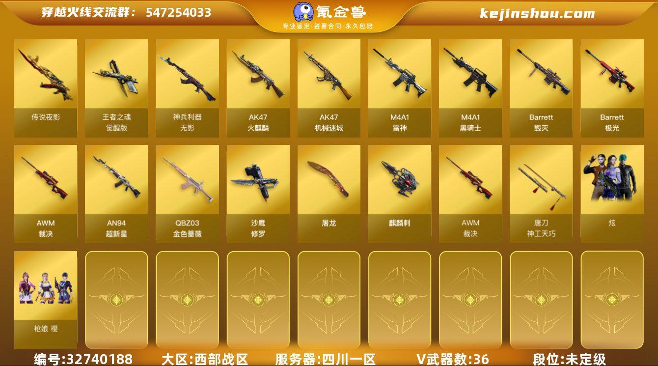 四川一区-40V-13王者武器数-0炫金武器数 【传说武器】:传说夜影 【热门武器】:传说夜影,QBZ03-金色蔷薇*2,Kar98K-星神,M4A1-黑骑士,沙鹰-修罗*5 【王者炫金武器】:王者之魄高爆手雷*3,王者之魄闪光弹*5,王者之魄烟雾弹*2 【音效卡】:M4A1-黑骑士音效卡,枪娘语音包-阿敏 【皮肤】:金色蔷薇-枪娘阿敏 皮肤,火麒麟-心动糖果,麒麟刺-甜蜜糖果 皮肤 【角色】:枪娘樱,嘉年华灵狐,娟娟,龙儿-小淘气,女主播,斯沃特-X 【人偶武器】:白虎-迷你小艾*2,AWM-灵狐-15周年嘉年华,灵狐娃娃手雷 【暴走生化】:黑龙吞噬者,超级对讲机 【英雄级武器】:AK47-火麒麟,M4A1-雷神,M4A1-黑骑士,AN94-超新星,AK47-机械迷城,无影-神兵利器,QBZ03-金色蔷薇*2,王者之魄-觉醒版,白虎之魄-觉醒版,Barrett-毁灭,Barrett-极光,AWM-裁决*2,Kar98K-星神,沙鹰-修罗*5,王者之魂-觉醒版,屠龙*5,麒麟刺*2,唐刀-神工天巧,高爆手雷-神工天巧,闪光弹-神工天巧*2,烟雾弹-神工天巧 【源级武器】:源·火麒麟,源·雷神,魂-雷神-萌杀,魂·雷神-15周年嘉年华,御·雷神-小白龙,魂-死神-机甲核心,源·机械迷城,源·青龙,魂·QBZ03-金色蔷薇-萌杀,源·天龙,魂·裁决-新人王绿豆*2...