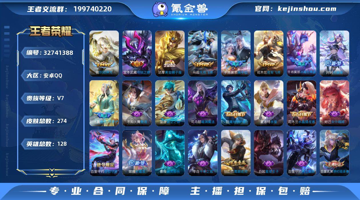 V7 1典藏 10传说 128英雄 274皮肤 可修改实名 【英雄全皮】敖隐全皮,空空儿全皮,大禹全皮 【稀有英雄】大司命,敖隐(小龙人),夏洛特(夏师傅),金蝉(唐僧),戈娅,赵云,嬴政(始皇帝),韩信(韩跳跳),艾琳,不知火舞,娜可露露(鸟人),橘右京(橘子) 【荣耀水晶】九霄神辉(木兰典藏) 【传说皮】画中仙,黄金狮子座,炽阳神光,地狱之眼,冠军飞将,超时空战士-狄仁杰,无双飞将 【珍宝阁皮】玩趣恶龙,胡桃夹子,优雅恋人 【赛季/战令皮】剑破天穹(s35),大漠名商(s28),千军破阵(s25),真爱魔法,沙漠行僧(s26),苍威无极,圣弓游侠,青焰无极,天穹之誓(s36),金庭之子(s27),噬灭天穹(s37),擒涛扼浪(s31),探海日志(s32),天穹祈灯(s34),古海寻踪(s33),海盐诗旅(s30),演武夺筹(s23),蔡文姬夏日便利店,虞姬夏日便利店,顽趣-梦奇,驱傩正仪(s24) 【史诗皮】高渐离燃音魔法,德古拉伯爵,节奏热浪,化蝶舞,月团寄思,曙光守护者,幽灵船长,地狱岩魂,乱世虎臣,茶境仙,猫狗日记-孙策,江河有灵,水果甜心,魅语,星界战将,器灵·浮梦炉,九幽镇关,圣诞狂欢,紫霞仙子,末日机甲-吕布,线条小狗-周瑜,暗渊魔法,天才门将,绅士熊喵,战舞者,无心,鬼剑武藏,暗隐猎兽者,破空之剑,圣诞恋歌,水晶猎龙者,永昼,千年之狐,蒙犽顽岩魄,...