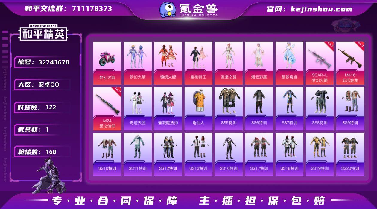 安卓【枪皮号 SCAR-L-梦幻火箭(七级)/M416-五爪金龙(七级)/M24-星之信仰(七级)/粉装-锦绣火鲤/粉装-蜜桃特工/角色-圣堂之誓/角色-烟云彩露/角色-星梦奇缘】 手Q-6粉装-3特效枪-1载具-3粉色飞行器-57784热力值-13王牌印记-122套装-168枪皮 【热门品类】:粉装-梦幻火箭,套装-龟仙人 【粉色套装】:粉装-梦幻火箭,粉装-锦绣火鲤,粉装-蜜桃特工,角色-圣堂之誓,角色-烟云彩露,角色-星梦奇缘 【粉色枪皮等级】:SCAR-L-梦幻火箭(七级),M416-五爪金龙(七级),M24-星之信仰(七级) 【粉色载具】:双人摩托-梦幻火箭 【粉色枪皮】:SCAR-L-梦幻火箭,M416-五爪金龙,M24-星之信仰 【粉色飞行器】:梦幻火箭飞行器,锦绣火鲤飞行器,星梦奇缘飞行器 【粉色降落伞】:精灵迷巫降落伞,梦幻火箭降落伞,锦绣火鲤降落伞,垂柳戏鸭降落伞,纯梦嫁纱降落伞,飒粉甜心降落伞,闲梦青缨降落伞,江南烟雨降落伞,精灵梦叶罗丽降落伞,创世·救赎降落伞,星梦奇缘降落伞 【稀有套装】:套装-龟仙人 【稀有枪皮】:AKM-星之信仰,AKM-江南烟雨,AKM-灼热熔岩,AKM-破晓战魂,AKM-虎虎生威,AKM-锦绣火鲤,AKM-霓虹街区,AKM-龙的传人,M16A4-红色方程式,M16A4-蓝色火焰,SCAR-L-炫彩节奏,S...