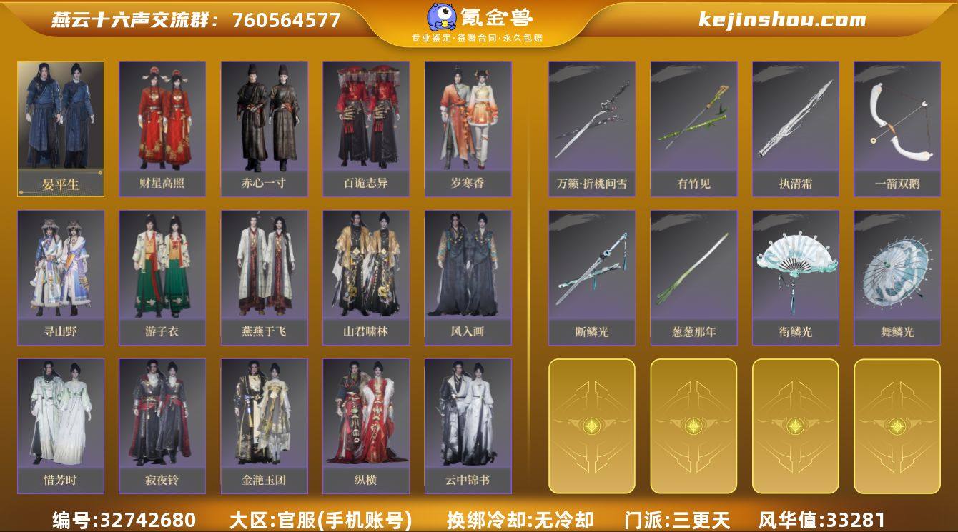 燕云逆水寒绘旅人世外全家桶 氪条燕云1700(已用八音窍3,芙蓉泣露,浮岚,万剑归宗) 逆水寒3500(已用天赏石2,织星诀,天钧,绝版服装舞乐火霓,青玉引 )绘旅人1000,六特葳蕤/二特人间/执迷天国本体 世外900,二花渡见春柏源,适合多坑玩家购入