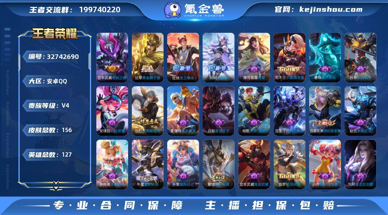 JJ4369:安卓Q-V4-荣耀王者-127英雄-156皮肤--4传说-40史诗 【稀有英雄】 嬴政 不知火舞 橘右京 夏洛特 娜可露露 韩信 艾琳 赵云 【传说皮肤】 地狱之眼 怒海麟威 黄金狮子座 鸣野蒿 【限定皮肤】 地狱之眼 无心 【史诗皮肤】 末日机甲 天秀·启明 妄想食味 德古拉伯爵 五谷丰年 无心 鬼剑武藏 星夜王子 龙之律动 摇滚巨星 顽趣 魅力维加斯 偶像歌手 荣光圣徽 晚萤 鹰眼统帅 李小龙 特工魅影 猫狗日记 原初追逐者 逐浪之夏 未来纪元 顽岩魄 功夫厨神 天才门将 圣诞恋歌 水晶猎龙者 星界战将 地狱岩魂 冰雪圆舞曲 节奏热浪 心灵骇客 箭羽风息 乱世虎臣 绅士熊喵 缤纷独角兽 水果甜心 化蝶舞 幽灵船长 乘风破浪 【勇者皮肤】 沙漠行僧 大漠名商 缤纷绘卷 纽约教父 拳王 龙舞盛年 功夫炙烤 沉稳之力 海盐诗旅 幻泉雾影 女武神 汉昭烈帝 白色死神 黄金武士 阴阳师 次元突破 古海寻踪 功夫老勺 西部大镖客 鲨炮海盗猫 海滩派对 红桃皇后 野性能量 潮玩探月行 天穹祈灯 阿尔法小队 五福同心 幻乐之宴 死亡骑士 敏锐之力 玩偶对对碰 海滩丽影 忍·炎影 雪境奇遇 炽热元素使 坚韧之力 唤灵魔甲 万事如意 擒涛扼浪 乓乓大师 死亡摇滚 探海日志 天使之翼 兔女郎 龙腾万里 金庭之子 花...