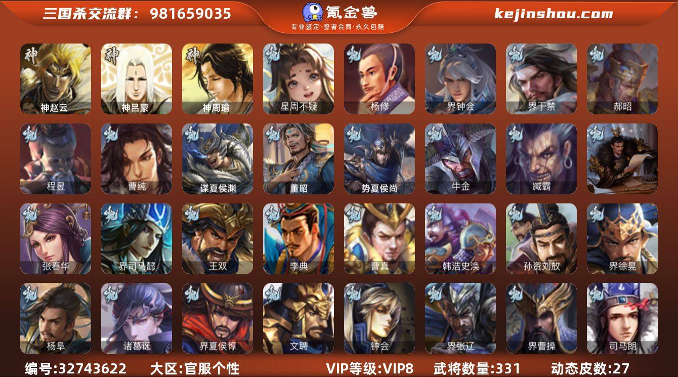 【4542】官阶:大将军;VIP等级:VIP8;史诗武将数量:25;动态皮肤数量:27;武将总数:331;史诗宝珠数量:0;将魂数量:2867;神将:1;魏国史诗武将:12;蜀国史诗武将:6;吴国史诗武将:3;群史诗武将:8