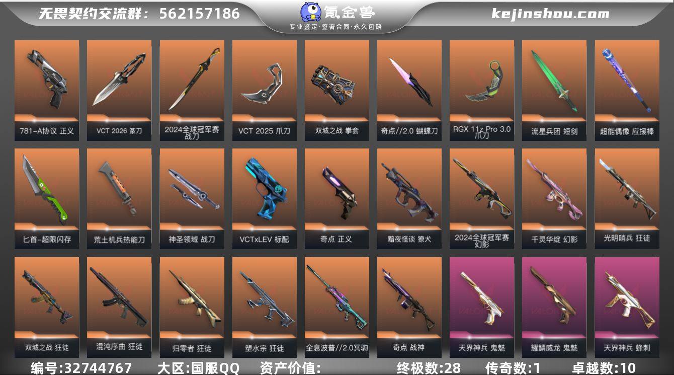 【套装】:2024全球冠军赛套装,VCT 2026 赛季套装,VCT 2025 赛季套装,《双城之战》收藏套装,英雄之选套装【英雄】:幻棱,炼狱,维斯,暮蝶,钛狐,壹决,铁臂,捷风,雷兹,幽影,不死鸟,贤者,猎枭,蝰蛇,零,芮娜,奇乐,尚勃勒,霓虹,斯凯,夜露,星礈,K/O,海神,盖可,黑梦,钢锁【近战武器】:近战武器-2024全球冠军赛 战刀,近战武器-VCT 2026 篆刀,近战武器-奇点//2.0 蝴蝶刀,近战武器-VCT 2025 爪刀,近战武器-RGX 11z Pro//3.0 爪刀,近战武器-落英飞旋,近战武器-威龙之刃,近战武器-鬼丸国纲,近战武器-双城之战 拳套,近战武器-流星兵团 短剑,近战武器-超能偶像 应援棒,近战武器-超限闪存 匕首,近战武器-定海神珍,近战武器-荒土机兵 热能刀,近战武器-神圣领域 战刀【狂徒】:狂徒-光明哨兵,狂徒-归零者,狂徒-混沌序曲,狂徒-双城之战,狂徒-塑水宗,狂徒-掠影,狂徒-盖世英雄,狂徒-紫阙金琅,狂徒-超能偶像,狂徒-荒土机兵,狂徒-流星兵团【幻影】:幻影-2024全球冠军赛,幻影-千灵华绽,幻影-侦察力量,幻影-超限闪存,幻影-神圣领域,幻影-聚合之力,幻影-纳米打击【戍卫】:戍卫-掠影,戍卫-天界神兵,戍卫-超能偶像,戍卫-浮光跃金,戍卫...