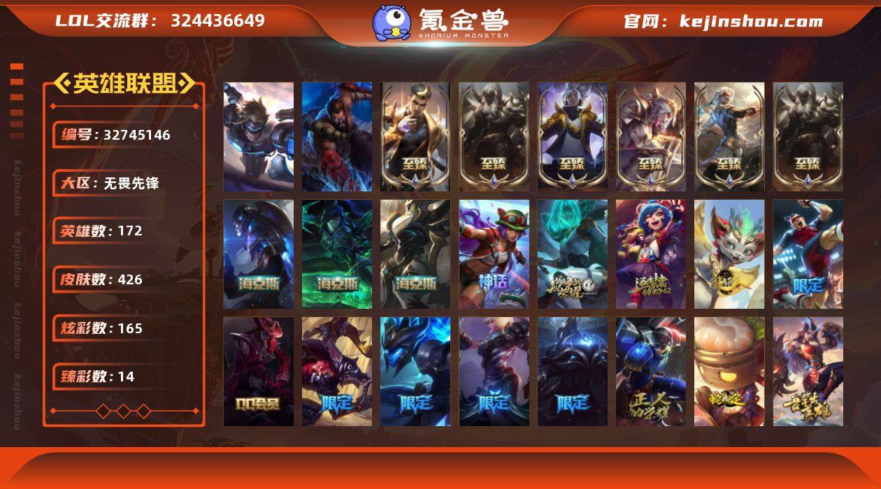 未定级段位-172英雄-426皮肤-165炫彩-2终极-13神话-44限定-41传说-109史诗 【神话皮肤】:十周年纪念安妮,源代码乐芙兰,十五周年纪念希维尔,神凰行者瑞羽圣凰艾尼维亚,海克斯科技玛尔扎哈,零之枪骑赫卡里姆,摄魂使者薇恩,至臻真实伤害亚索,至臻黑夜使者凯隐,至臻女帝黛安娜,至臻腥红之月亚托克斯,至臻腥红之月亚托克斯2022 【珍稀头像】:星守阿狸头像 【热门头像】:爱意绵绵头像,爱情之歌头像,银河魔装机神安妮头像 【至臻皮肤】:至臻T1杰斯,至臻女帝黛安娜,至臻黑夜使者凯隐,至臻真实伤害亚索,至臻腥红之月亚托克斯,至臻腥红之月亚托克斯(2022) 【臻彩皮肤】:天龙之子卡莎飞龙乘云,无畏骑士瑟庄妮赤子初心,墨之影武者亚索金墨耀影,冠军之隐劫凯旋圣装,星之守护者辛德拉未来之光,幻灵战斗蝠薇恩梦幻强袭,泳池派对奥莉安娜优雅珠光鲸,霸天巨兽雪崩墨菲特,可爱可爱粉红红布里茨,春晖神女艾希玉露金风,魔女阿卡丽虚荣,净雪之月莫甘娜冬虹,水晶玫瑰迦娜甜蜜花蕾 【年限皮肤】:天龙之子斯莫德,点心宝贝阿木木 【海克斯皮肤】:摄魂使者薇恩,海克斯科技玛尔扎哈,零之枪骑赫卡里姆 【冰雪限定】:圣诞开心鬼提莫,圣诞狂欢基兰,阿木木“主人不...