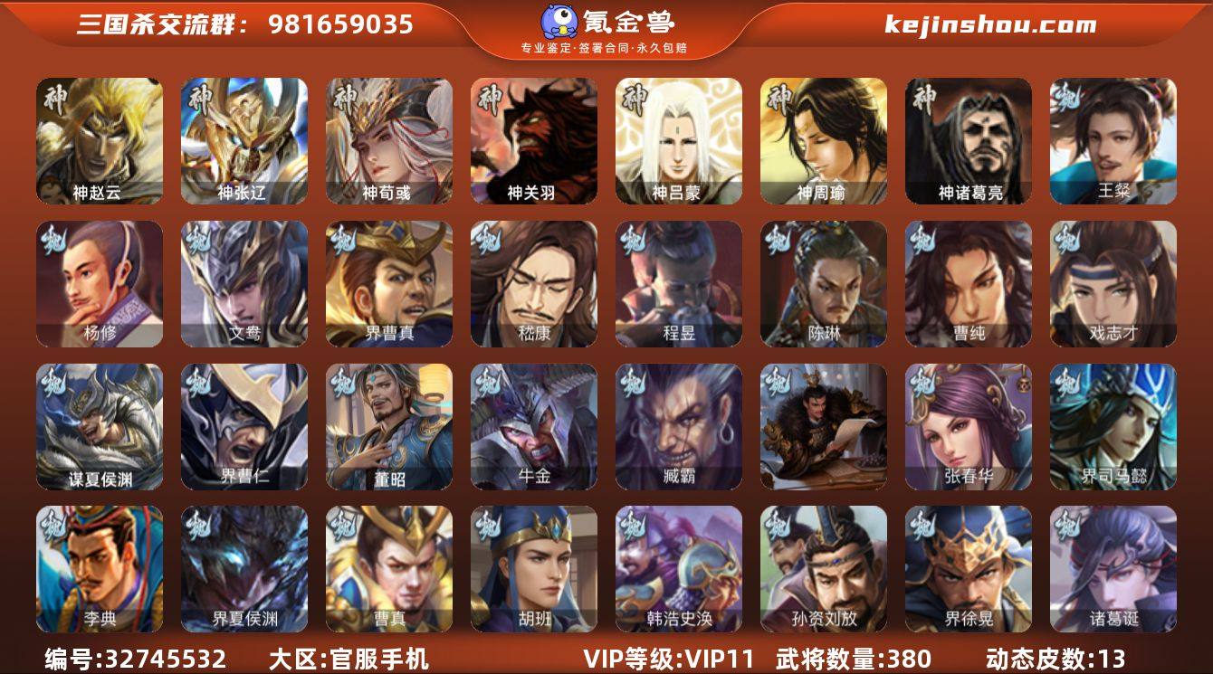 【14789832】官阶:大将军;VIP等级:VIP11;史诗武将数量:35;动态皮肤数量:13;武将总数:380;史诗宝珠数量:1;将魂数量:561;神将:4;魏国史诗武将:11;蜀国史诗武将:10;吴国史诗武将:7;群史诗武将:8