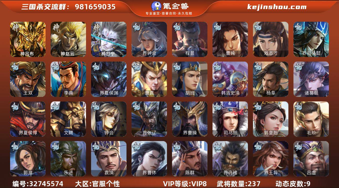 【14789831】官阶:骠骑将军;VIP等级:VIP8;史诗武将数量:16;动态皮肤数量:9;武将总数:237;史诗宝珠数量:0;将魂数量:3974;神将:3;魏国史诗武将:8;蜀国史诗武将:2;吴国史诗武将:3;群史诗武将:4
