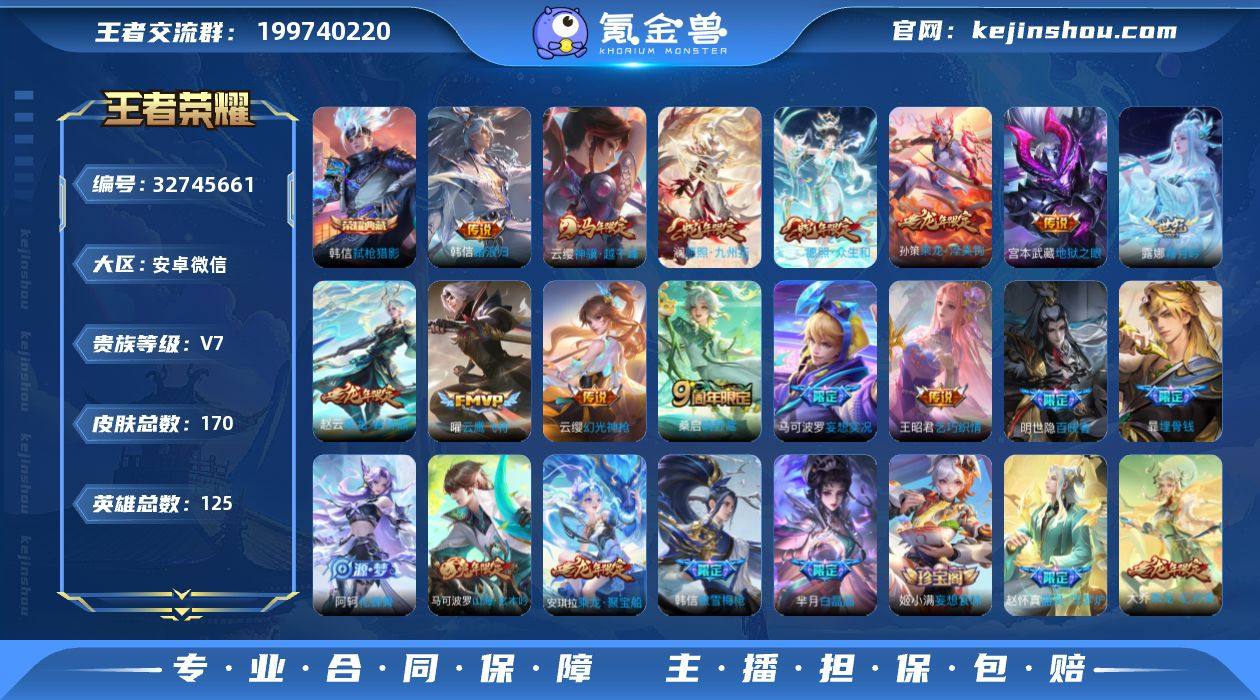 【V7 1典藏 15传说 170皮肤 125英雄】打野36段 市标赵云 韩信 1典藏15传说 弑枪猎影 云鹰飞将,逐花归海,妄想实况,地狱之眼,乞巧织情,霜月吟,乘龙·淬吴钩,乘龙·铭钟鼎,冥王哈迪斯,鸣野蒿,幻光神枪,愿照·众生和,愿照·九州拓,神骥·越千峰,踏浪归傲雪梅枪,纤云弄巧,猫狗日记(孙策),原初追逐者,特工魅影,曙光守护者,猫狗日记(大乔),天秀·启明,山海·玄木吟,冰冠公主,黎明之约,乘风破浪,未来纪元(赵云),皇家上将,百木心枪,魅力维加斯,功夫厨神,圣诞恋歌,白龙吟,冰雪圆舞曲,水果甜心,末日机甲(吕布),鬼剑武藏,魔术师,鹰眼统帅,白晶晶,银河之约,暗隐猎兽者,地狱岩魂,千年之狐,幽灵船长,节奏热浪,偶像歌手,乘龙·聚宝船,乘龙·忆丹青,江河有灵,妄想食味,真我赫兹(百里守约),青焰无极,顽岩魄,埋骨钱,破空之剑,谪仙醉月,茶境仙,星界战将,器灵·浮梦炉,化蝶舞,蔬乡物语,百相守梦,线条小狗,百晓客,编号:QNYNP50