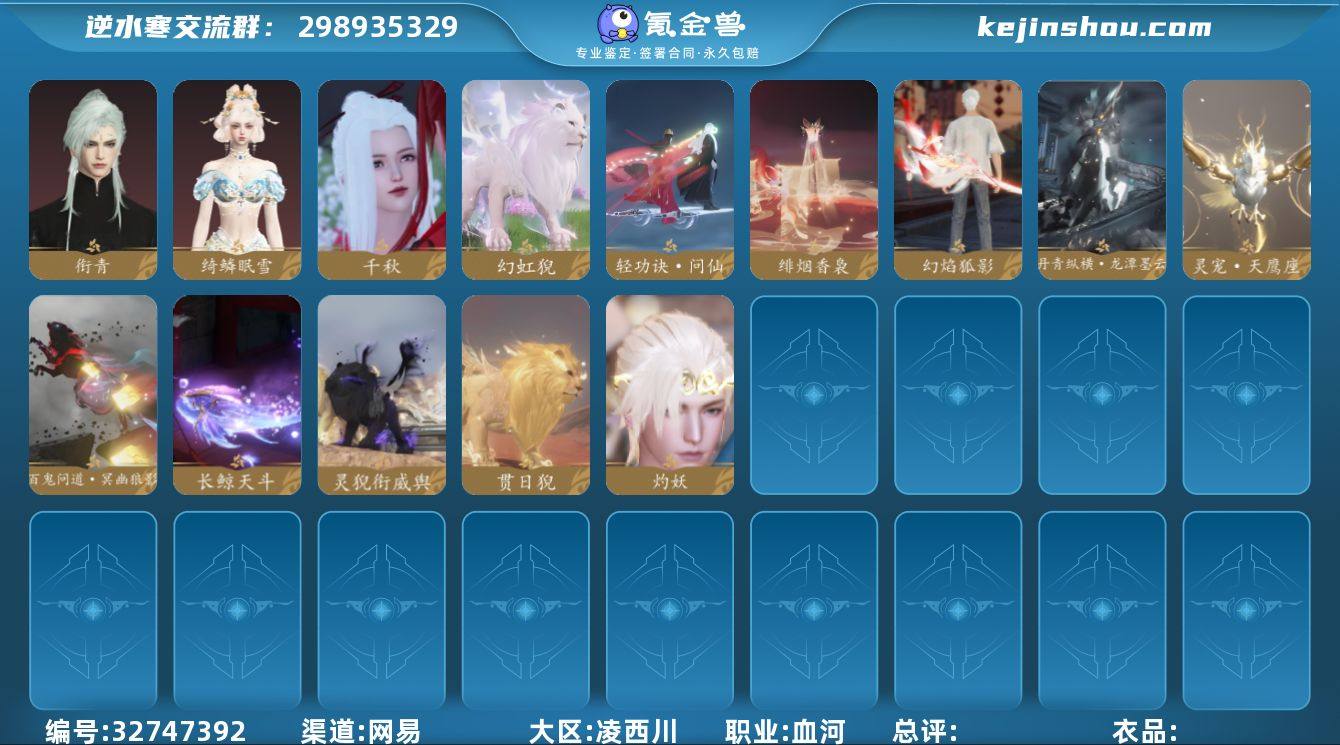 【已用天赏23-转盘1】已用天赏石:23 天霓染数量:1 【网易手机账号】 【无换绑冷却】 【血河】 【男】 【6级】 【互通】 转盘外观1 副本外观5 天赏外观10 天赏祥瑞3 天赏灵宠1 武器环身10 转盘外观:灼妖; 副本外观:白夜拂雪,霜途无间,飞焰流波,紫宿宸极,星剑分野; 天赏外观:虔心,衔青,绮鳞眠雪,千秋,幻焰狐影,雷霆武器,轻功诀问仙,绯烟香袅,明河曙天·长鲸天斗,丹青纵横·龙潭墨云; 天赏祥瑞:灵猊衔威舆,贯日猊,幻虹猊; 天赏灵宠:灵宠·天鹰座; 武器环身:渊墟深影,谪仙雷剑,赤焰流光,掌星执辰,谪仙人,银甲霜锋,照罪赦渊,裁谕破愿,啸鲸掀涛,法枯象荣;