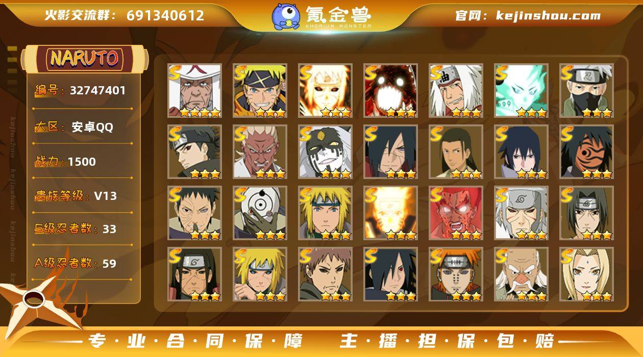 【942533】ad17,贵13,1500万战,33s忍59a忍,猿飞日斩(4星),漩涡鸣人·宇智波佐助(3星),漩涡鸣人「暴怒·第六尾」(3星),漩涡鸣人「九喇嘛连结」(3星),宇智波佐助「永恒万花筒」(3星),旗木卡卡西「须佐能乎」(3星),自来也「舞之豪杰」(3星),自来也「传说中的三忍」(3星),大蛇丸(3星),纲手(3星),迈特凯「死门」(3星),波风水门(3星),波风水门「九喇嘛连结」(3星),波风水门「秽土转生」(3星),千手扉间「秽土转生」(3星),千手柱间「秽土转生」(3星),千手柱间「木叶创立」(3星),宇智波斑「木叶创立」(3星),宇智波斑「秽土转生·解」(3星),宇智波鼬「须佐能乎」(3星),宇智波止水「须佐能乎」(3星),宇智波斑 「白面具」(3星宇智波斑「白面具」),宇智波带土「忍界大战」(3星),神秘面具男「红夜之刃」(3星),罗砂「四代目风影」(3星),艾「忍界大战」(3星),大野木「忍界大战」(3星),佩恩「天道」(3星),大筒木舍人「最终章」(3星),大筒木桃式(3星),大筒木金式(3星)