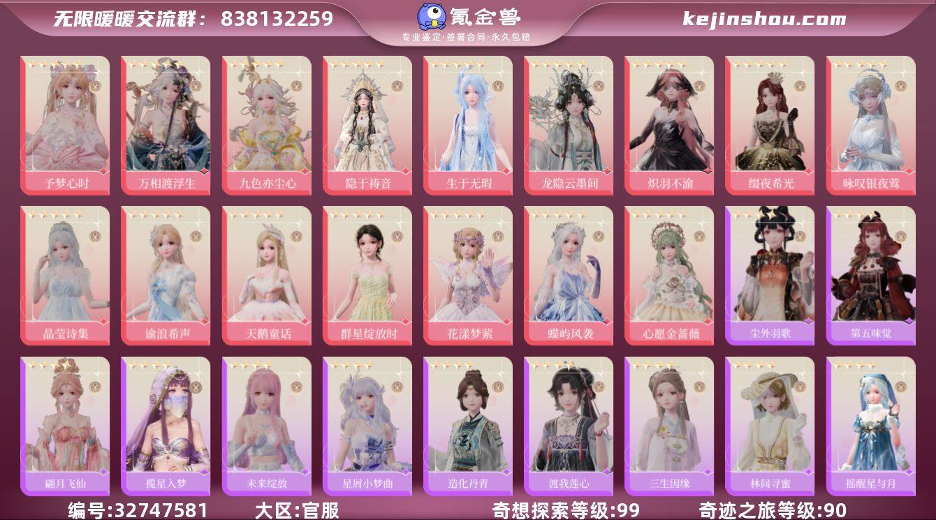 开服账号、99级,氪条2000+、大月卡没断过,蓝钻900+ 在挂期间也不会断登,每天坚持做任务 限定池:蝴蝶,精灵,鸟套,圣女,神女,龙套,鹿套,扇子套都是一进。 烟花,独角兽抽齐。 八音盒有头发、大裙子、发条、袖子、手套。玩偶大件都有,鞋子和手持物没有。鱼套差两件,但是重要部件都有。蛇套差头发、裙子、手持物。猫套有耳朵、头花、外套、项链、鞋子。 常驻池:海浪,晶莹诗集,群星都是二进,天鹅(满进)。 陪跑四星:相机套,画家套,狗王套,幽灵套,睡袍套,裁缝套,睡梦套,白蛾套,甜品套,水袖套,鹤套,唱诗班,舞女 四星套:梦露套,湖女,花束套,机车套,浇水套,歌姬套,青鸟套,大网套,小蜘蛛(满进),乌鸦套 奇迹套:金蔷薇满进,星之海满进,蔼灵二进 免活都有