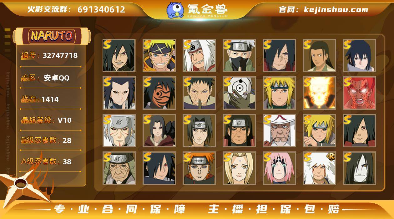实名: 可修改 贵族等级: V10 S忍数: 28 A忍数: 38 战力值(万): 1414 S级忍者: 千手柱间「秽土转生」,宇智波鼬「秽土转生」,宇智波斑 「木叶创立」,千手扉间「秽土转生」,波风水门「秽土转生」,猿飞日斩「秽土转生」,宇智波斑,佩恩「天道」,大蛇丸,波风水门,纲手,宇智波鼬 「须佐能乎」,猿飞日斩,迈特凯「死门」,三代目风影 「秽土转生」,宇智波带土 「忍界大战」,自来也 「舞之豪杰」,宇智波斑「白面具」,漩涡鸣人 「九喇嘛连结」,春野樱 「忍界大战」,神秘面具男 「红夜之刃」,宇智波佐助「永恒万花筒」,千手柱间·木叶创立,宇智波斑「秽土转生·解」,旗木卡卡西「须佐能乎」,自来也 「传说中的三忍」,漩涡鸣人·宇智波佐助,宇智波斑「神驹佑将」 亮点: 【优质装备】:千手柱间「秽土转生」,宇智波鼬「秽土转生」,宇智波斑 「木叶创立」,千手扉间「秽土转生」,波风水门「秽土转生」,猿飞日斩「秽土转生」,宇智波斑,迈特凯「死门」,三代目风影 「秽土转生」,宇智波带土 「忍界大战」,宇智波斑「白面具」,漩涡鸣人 「九喇嘛连结」,春野樱 「忍界大战」,神秘面具男 「红夜之刃」,宇智波佐助「永恒万花筒」,千手柱间·木叶创立,宇智波斑「秽土转生·解」,旗木卡卡西「须佐能乎」,自来也...