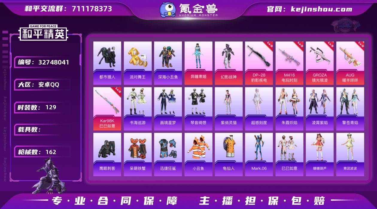 安卓 手Q-2粉装-8特效枪-0载具-0粉色飞行器-45316热力值-11王牌印记-129套装-162枪皮 【热门品类】:套装-都市猎人,套装-派对舞王,套装-深海小丑鱼,套装-小丑鱼,套装-龟仙人,角色-Mark.06 【粉色套装】:粉装-幻影战神,角色-异瞳寒姬 【粉色枪皮等级】:M416-电玩时刻(五级),GROZA-镜光银凌(五级),AUG-暖羊咩咩(五级),AKS-74U-森灵之息(五级),Kar98K-巳巳如意(五级),Mk14-福马献瑞(五级),AA12-G-萌骑幻想(四级),DP-28-豹影疾电(五级) 【粉色枪皮】:M416-电玩时刻,GROZA-镜光银凌,AUG-暖羊咩咩,AKS-74U-森灵之息,Kar98K-巳巳如意,Mk14-福马献瑞,AA12-G-萌骑幻想,DP-28-豹影疾电 【粉色降落伞】:极限特训降落伞,星之彼岸降落伞,第五大道降落伞,临安公主降落伞,樱桃泡泡降落伞,幻彩电音降落伞,喜羊羊与灰太狼降落伞,异瞳寒姬降落伞,极意拳锋降落伞,炫彩糖果降落伞 【稀有套装】:套装-龟仙人,套装-巳巳如意,角色-超感刻度,套装-雪国风尚,套装-马上来财,套装-迅捷龙虾,套装-糖糖葫芦,套装-青团波波,套装-燕燕于飞,套装-鱼渊荷华,角色-海琴烟,套装-紫幽梦,套装-蓝冰羽,套装-星渊小夜曲,套装-朱霞炽焰,套装-凌霄紫焰,套装-擎苍青焰...