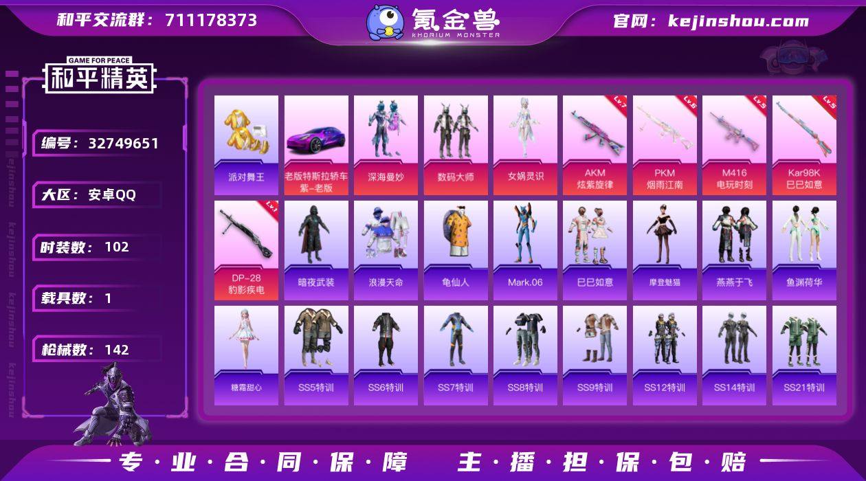 安卓 手Q-3粉装-5特效枪-1载具-1粉色飞行器-48161热力值-4王牌印记-102套装-142枪皮 【热门品类】:套装-浪漫天命,套装-派对舞王,套装-龟仙人,角色-Mark.06 【粉色套装】:粉装-深海曼妙,粉装-数码大师,角色-女娲灵识 【粉色枪皮等级】:AKM-炫紫旋律(七级),M416-电玩时刻(五级),Kar98K-巳巳如意(五级),DP-28-豹影疾电(一级),PKM-江南烟雨(六级) 【粉色载具】:特斯拉Model 3(奇幻紫) 【粉色枪皮】:AKM-炫紫旋律,M416-电玩时刻,Kar98K-巳巳如意,DP-28-豹影疾电,PKM-江南烟雨 【粉色飞行器】:星夜魔法师飞行翼 【粉色降落伞】:深海曼妙降落伞,春暖花开降落伞,梦幻火箭降落伞,炫紫旋律降落伞,江南烟雨降落伞,精灵梦叶罗丽降落伞,金丰海韵降落伞,鬼刀降落伞 【稀有套装】:套装-龟仙人,套装-巳巳如意,角色-摩登魅猫,套装-燕燕于飞,套装-鱼渊荷华,角色-糖霜甜心 【稀有枪皮】:AKM-天启纪元,AKM-影袭,AKM-江南烟雨,AKM-霓虹街区,AKM-龙的传人,M16A4-生命誓言,SCAR-L-玉兔迎春,SCAR-L-生命誓言,M416-蓝色火焰,GROZA-黑色刀锋,AUG-天降萌叽,AUG-耀粉歌者,QBZ-彩虹符号,M762-拳皇97,M762-深海曼妙,M762-牛气冲天,蜜獾-垂柳戏鸭,蜜獾-...
