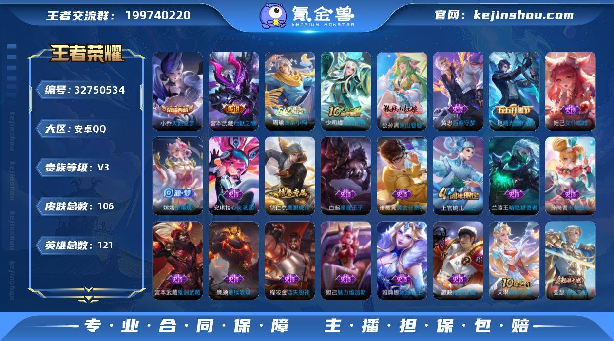 【女神小号·小乔天鹅之梦·106皮肤·低价出售】安卓Q-V3-最强王者段位-121英雄-106皮肤-1典藏皮肤-1传说-19史诗 【荣耀典藏】:小乔天鹅之梦 【传说皮肤】:宫本武藏地狱之眼 【限定皮肤】:白起狰,狄仁杰阴阳师,虞姬凯尔特女王,扁鹊炼金王,曹操烛龙,狄仁杰万华元夜,项羽海滩派对,程咬金演武夺筹,钟馗驱傩正仪,干将莫邪胡桃夹子,鬼谷子原初探秘者,裴擒虎擒涛扼浪,米莱狄御霄,上官婉儿梁祝,嫦娥拒霜思,桑启海盐诗旅,张良古海寻踪,鬼谷子天穹祈灯 【赛季限定】:扁鹊炼金王,虞姬凯尔特女王,白起狰,曹操烛龙,米莱狄御霄,鬼谷子原初探秘者,狄仁杰万华元夜,程咬金演武夺筹,钟馗驱傩正仪,桑启海盐诗旅,裴擒虎擒涛扼浪,张良古海寻踪,鬼谷子天穹祈灯,钟馗虚灵犬护,甄姬逆浪荇歌,亚瑟荣光之誓 【战令限定】:周瑜线条小狗 【史诗皮肤】:周瑜线条小狗,少司缘巫礼祀神,公孙离涂山容容,黄忠百相守梦,嫦娥拒霜思,上官婉儿梁祝,狄仁杰鹰眼统帅,白起星夜王子,程咬金功夫厨神,铠曙光守护者,安琪拉心灵骇客,雅典娜冰冠公主,诸葛亮黄金分割率,兰陵王暗隐猎兽者,妲己女仆咖啡,妲己魅力维加斯,嬴政摇滚巨星,孙尚香水果甜心,宫本武藏鬼剑武藏,廉...