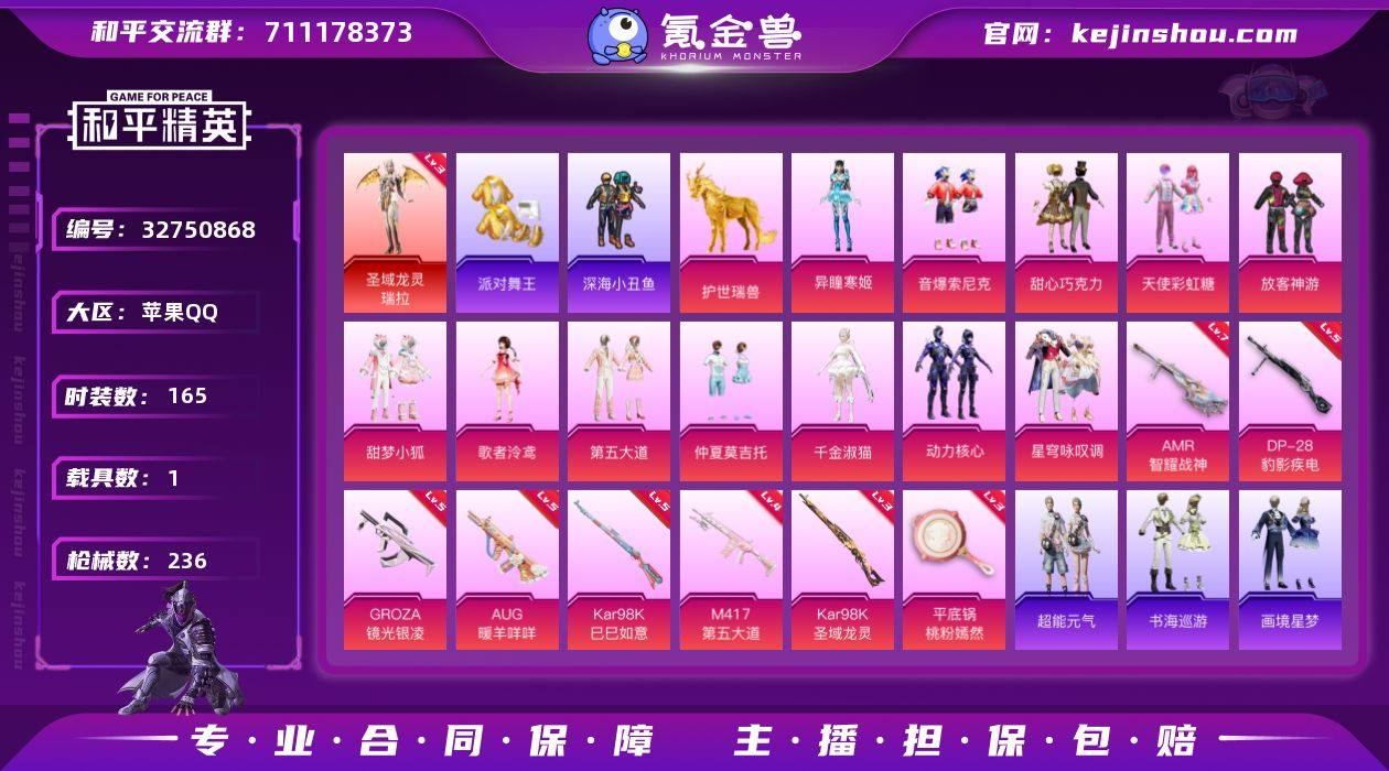 h10869红装少萝号 1红 12粉 11特 1载具 1僚机 3级圣域龙灵 甜心巧克力 放客神游 甜梦小狐 派对舞王 红熊茄茄 暗影哥特 软软马卡龙 7智耀战神 护世瑞兽 苹果 手Q-1神装-12粉装-11特效枪-1载具-9粉色飞行器-77376热力值-10王牌印记-165套装-236枪皮 【红色神装等级】:圣域龙灵-瑞拉(三级) 【红色角色神装】:圣域龙灵-瑞拉 【热门品类】:粉装-音爆索尼克,套装-浪漫天命,套装-派对舞王,套装-深海小丑鱼,套装-龟仙人,套装-潮萌小黄鸭,套装-暗影哥特,套装-糯粉咩咩,套装-软软马卡龙,套装-红熊茄茄 【粉色套装】:粉装-甜心巧克力,粉装-天使彩虹糖,粉装-放客神游,粉装-甜梦小狐,角色-歌者泠鸢,粉装-音爆索尼克,粉装-第五大道,粉装-仲夏莫吉托,角色-千金淑猫,粉装-动力核心,粉装-星穹咏叹调,角色-异瞳寒姬 【粉色枪皮等级】:GROZA-镜光银凌(五级),AUG-暖羊咩咩(五级),ACE32-萌骑漫游(二级),AKS-74U-森灵之息(五级),Kar98K-巳巳如意(五级),Kar98K-圣域龙灵(三级),Mk14-福马献瑞(五级),AMR-智耀战神(七级),M417-第五大道(四级),DP-28-豹影疾电(五级),平底锅-桃粉嫣然(三级) 【粉色载具】:僚机-圣域龙宝,护世瑞兽 【粉色枪皮】:GROZA-镜光银凌,A...
