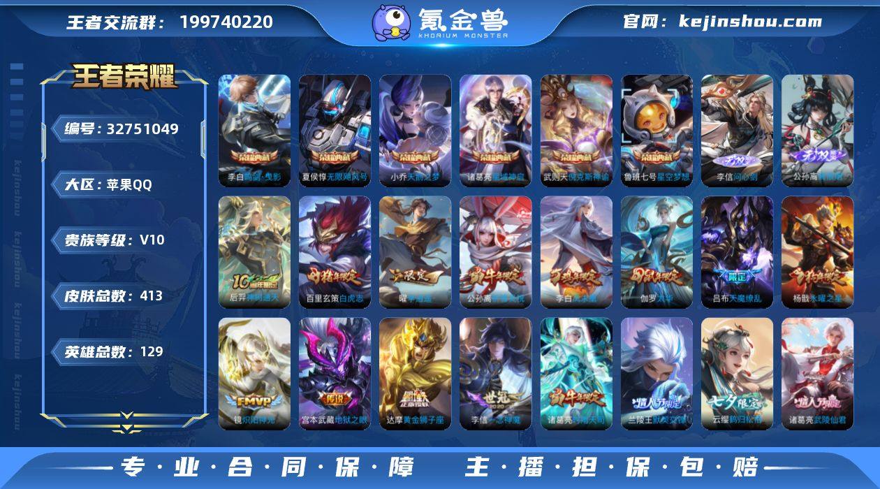 【aswz1869】苹果Q-V10-最强王者段位-129英雄-412皮肤-6典藏皮肤-1典藏英雄-2无双-41传说-137史诗 【英雄全皮】:刘邦全皮,孙权全皮,猪八戒全皮,敖隐全皮,影全皮,海诺全皮 【荣耀典藏】:武则天英雄,武则天倪克斯神谕,夏侯惇无限飓风号,小乔天鹅之梦,鲁班七号星空梦想,李白鸣剑曳影,诸葛亮星域神启 【无双皮肤】:李信问心剑,公孙离离恨烟 【传说皮肤】:后羿神树通天,桑启鸣野蒿,铠冥王哈迪斯,艾琳觅芳踪,兰陵王影龙天霄,云缨鹤归松栖,东皇太一灼幽烈阳,诸葛亮鹤羽星尊,李白诗剑行,孙尚香异界灵契,貂蝉遇见胡旋,赵云淬星耀世,西施游龙清影,曜李逍遥 ,兰陵王默契交锋,公孙离祈雪灵祝,诸葛亮时雨天司,镜炽阳神光,虞姬启明星使,孙悟空零号赤焰,关羽武圣,曜云鹰飞将,李信一念神魔,刘备时之恋人,伽罗太华,张良黄金白羊座,干将莫邪久胜战神,虞姬云霓雀翎,达摩黄金狮子座,百里玄策白虎志,花木兰冠军飞将,后羿黄金射手座,杨戬永曜之星,诸葛亮武陵仙君,貂蝉仲夏夜之梦,李白凤求凰,宫本武藏地狱之眼,孙悟空地狱火,吕布天魔缭乱,武则天海洋之心,狄仁杰超时空战士 【限定皮肤】:白起狰,公孙离离恨烟,铠冥王哈迪斯,暃埋骨钱,姜...