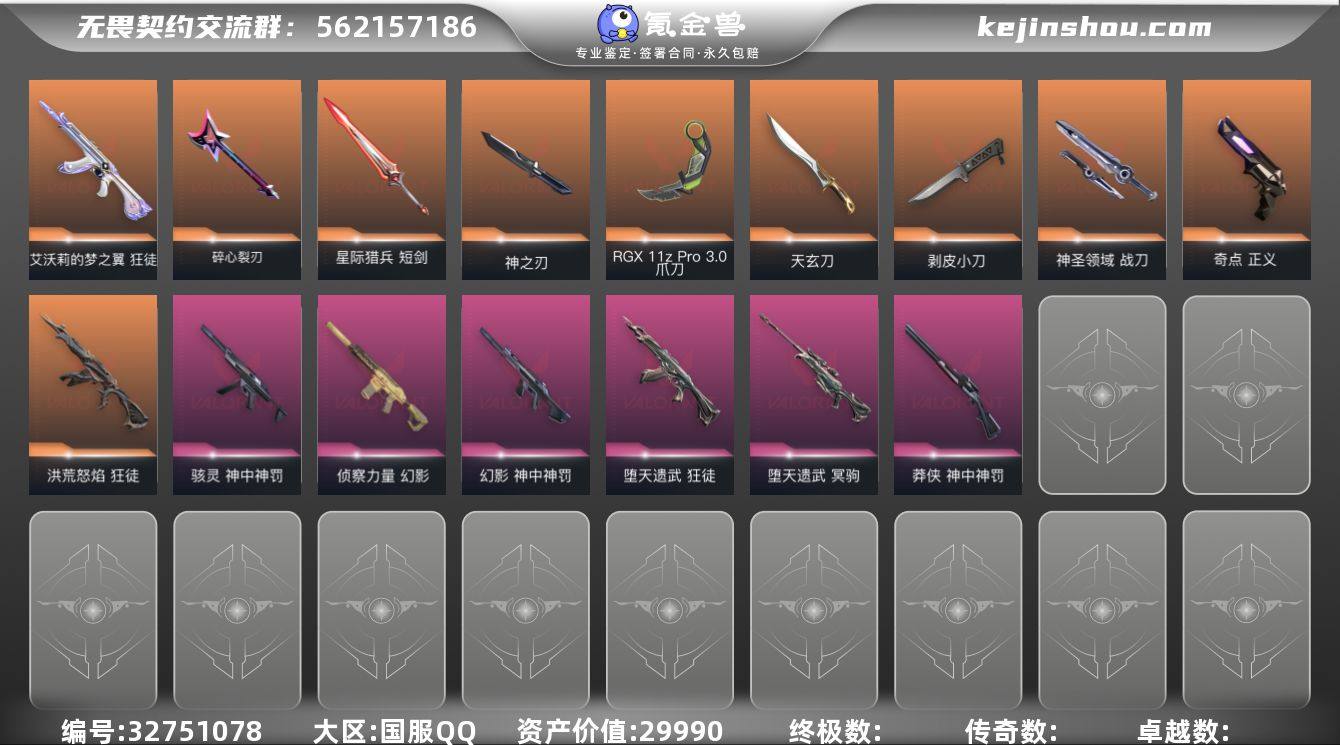 MWW624【价值29990 剥皮小刀 RGX 11z Pro 天玄刀 】【游戏等级】Lv133 【段位】 黄金I 【R点】950 【皮肤总价值】29,990 【英雄数量】26 【皮肤数量】69 【挂饰数量】74 【卡面数量】103 【喷漆数量】88 【近战武器】近战武器-蒙太奇战斧 近战武器-剥皮小刀 近战武器-RGX11zPro//3.0爪刀 近战武器-天玄刀 近战武器-碎心裂刃 近战武器-星际猎兵短剑 近战武器-神之刃 近战武器-神圣领域战刀 【狂怒】狂怒-蒙太奇 狂怒-光环序列 狂怒-神中神罚 狂怒-神圣领域 【狂徒】狂徒-超集系统 狂徒-堕天遗武 狂徒-洪荒怒焰 狂徒-幻心猎手 狂徒-瑰梦艺语 狂徒-日冕雄师 狂徒-艾沃莉的梦之翼 【冥驹】冥驹-风暴之子 冥驹-诛心猎手 冥驹-堕天遗武 冥驹-光环序列 冥驹-星云暗涌 【战神】战神-蒙太奇 战神-光环序列 战神-神圣领域 【雄鹿】雄鹿-风暴之子 雄鹿-瑰梦艺语 雄鹿-月球哨兵 【幻影】幻影-蒙太奇 幻影-侦察力量 幻影-甜心猎手 幻影-星际猎兵 幻影-神中神罚 幻影-神圣领域 【标配】标配-超集系统 标配-VCT25xEDG 标配-星际猎兵 【戍卫】戍卫-风暴之子 戍卫-甜心猎手 戍卫-光环序列 戍卫-月球哨兵 【骇灵】骇灵-蒙太奇 骇灵-瑰梦艺语 骇灵-神中神罚 骇灵-星云暗涌 【飞将】飞将-超集系统...