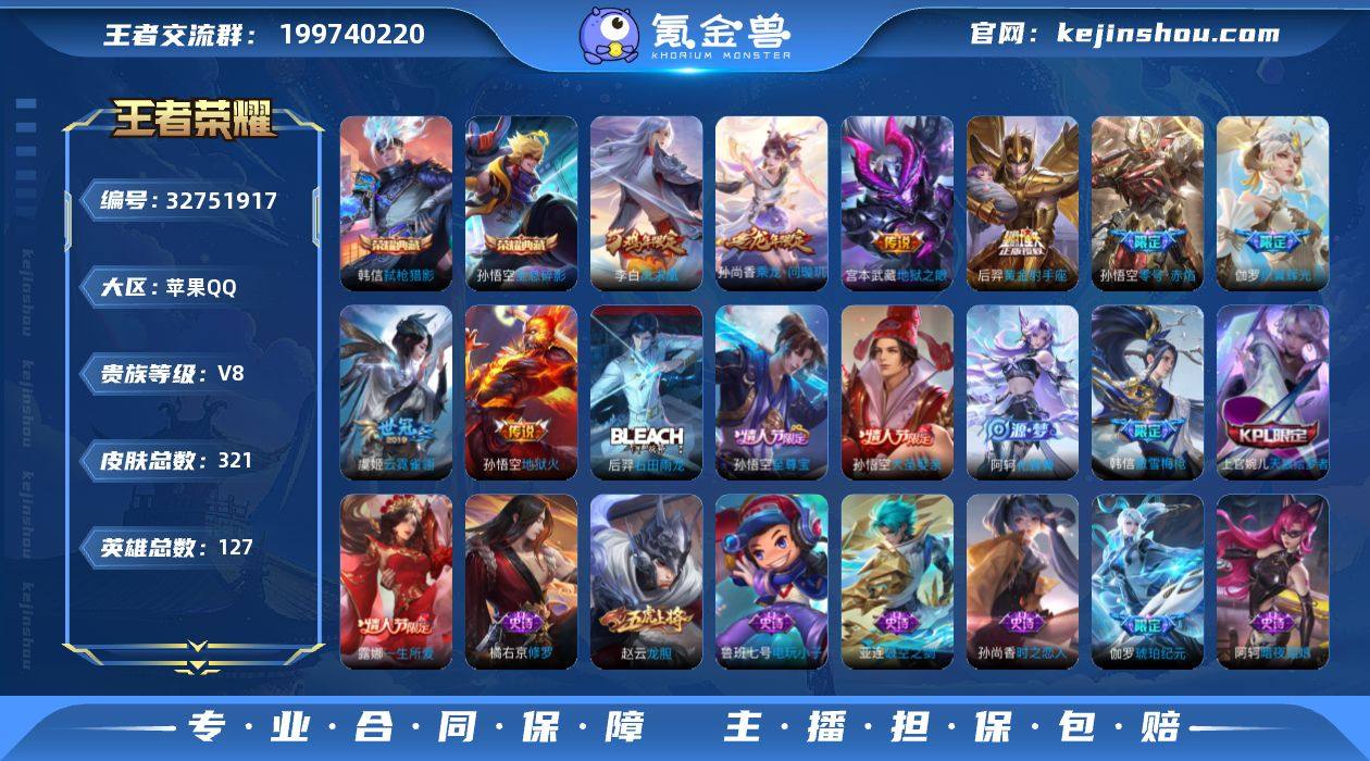 说 127英雄 321皮肤 可修改实名 男号 【英雄全皮】刘邦全皮,大禹全皮 【稀有英雄】大司命,嬴政(始皇帝),韩信(韩跳跳),夏洛特(夏师傅),艾琳,橘右京(橘子),娜可露露(鸟人),不知火舞,赵云,金蝉(唐僧),戈娅 【荣耀水晶】弑枪猎影(韩信典藏),全息碎影(猴子典藏) 【传说皮】乘龙·问璇玑(孙尚香年限),神树通天,黄金射手座,零号·赤焰,地狱火,地狱之眼,末日机甲-孙尚香(绿蚂蚱),云霓雀翎,炽翼辉光(娃娃菜牛角包) 【珍宝阁皮】胡桃夹子,蔷薇恋人,玩趣恶龙 【赛季/战令皮】噬灭天穹(s37),古海寻踪(s33),海盐诗旅(s30),擒涛扼浪(s31),潮玩骑兵,奇幻香踪,探海日志(s32),剑破天穹(s35),天穹祈灯(s34),天穹之誓(s36),狰(s8),饕餮(s9),烛龙(s10),重明(s11),穷奇(s12),御狮(s13),御霄(s14),御旌(s15),御銮(s16),朔风刀(s17),混沌棋(s18),疑决卦(s19),醍醐杖(s20),原初探秘者(s21),万华元夜(s22),演武夺筹(s23),驱傩正仪(s24),千军破阵(s25),猎兽之王,白昼王子,朔望之晖,蓝屏警告,神迹守卫-钟馗,狮舞东方,赤莲之焰,驯魔猎人,星空之诺,银河之约,夺宝奇兵,迷踪丽影,西部大镖客-猪八戒,暗影游猎(游乐娃子),单词大作战,狂想玩偶喵,火炮绅士,沙漠行僧(s26),幻夜卜梦,夜都怪侠,金庭之子(s27),大漠名商...