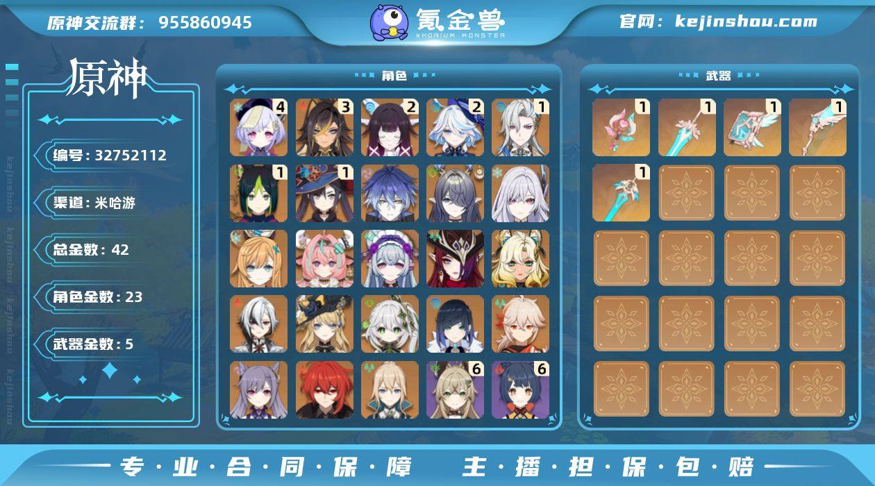 42黄!月感电战舰!冰水战舰!龙芙万希!2命少女!2命芙宁娜!1命龙王!菲林斯!丝柯克!爱可菲!希诺宁!菈乌玛!0+1牛牛!恰斯卡!阿蕾奇诺!草神!夜兰!万叶!冒险等级: 60 4命金色角色: 四命七七 3命金色角色: 三命迪希雅 2命金色角色: 二命芙宁娜,二命哥伦比娅 1命金色角色: 一命莫娜,一命提纳里,一命那维莱特 0命金色角色: 迪卢克,枫原万叶,刻晴,琴,夜兰,纳西妲,娜维娅,阿蕾奇诺,希诺宁,恰斯卡,梦见月瑞希,瓦雷莎,爱可菲,丝柯克,菈乌玛,菲林斯 拥有武器: 天空之翼,天空之卷,天空之傲,天空之刃,溢彩心念 1精武器: 天空之翼,天空之卷,天空之傲,天空之刃,溢彩心念