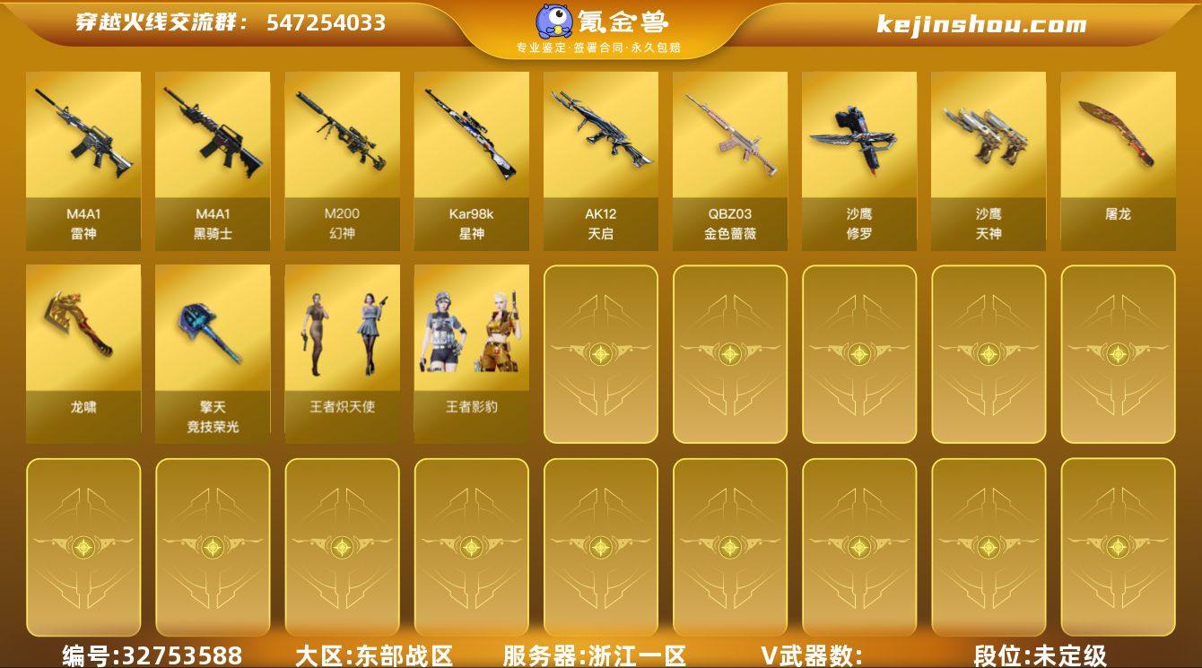 5949/东部/浙江一区/可排位/段位未定段/Lv.99 上将6/45V/【幻神三件套】/幻神/幻神音效卡/幻神荣耀世冠白鲨/幻神黄忠/星神/【QBZ三件套】/QBZ金色蔷薇/QBZ金色蔷薇音效卡/金色蔷薇破浪逐光皮肤/柯尔特荣耀世冠EP/王者之怒/烈火动感闪耀套/雷神/黑骑士/【音效卡】/黑骑士音效卡/碧霄极光音效卡/【枪皮】/火麒麟百城/雷神荣耀之魄/毁灭黑大圣皮肤/【四防】/王者影豹/王者炽天使/【角色】/奇洋探员/乔伊教练/云海玲珑/0号玩家/【小人枪】/M4A1雷神精英刀锋/【道具】/永久烟雾头/护目镜/超级背包/各种戒指/各种光效/各种玩偶/永久AC/永久雷包/细节看图/【此账号未被封过十年】