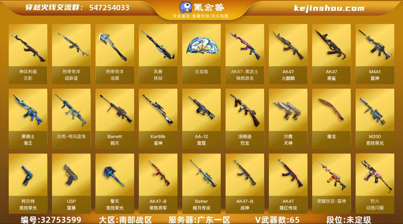 广东一区-71V-2王者武器数-0炫金武器数 【传说角色】:传说影煞 【热门武器】:M200-竞技荣光,荣耀世冠-雷神,白虎-电玩蓝兔,Kar98K-星神,金色小号,汤姆逊-烈龙*6,金色蔷薇-空,斯泰尔-蝴蝶,USP-雷暴 【音效卡】:Kar98K-星神音效卡 【皮肤】:金色蔷薇-电竞之星 皮肤,雷神-暗月,火麒麟-雷神,火麒麟-平天大圣,火麒麟-心动糖果,毁灭-风暴,毁灭-魔灵皮肤,毁灭-秦师 皮肤,毁灭-英雄计划 皮肤,战神-粉色甜心皮肤,战神-紫绶金章皮肤,战神-流金岁月皮肤,AK47-B-常胜将军-孙权,修罗-能量核心,屠龙-春桃 皮肤 【角色】:岚兮儿,战地猎狐,奇洋探员,乔伊教练,修道士,幻面灵狐,暗夜-X,初恋灵狐,芳心审判者,飞虎队-X,风暴女*2,虎妞,嘉年华灵狐,娟娟,猎狐者-追月,灵狐者-黄金海岸,灵狐者-七夕宝贝,麻雀,潘多拉-X,潘多拉-甜心教官,青霞仙子,斯沃特-X,蜀雪,铁骑荣耀,兔囡囡,雪莉杨-摸金校尉,樱-战斗天使,影武者-X,游珑儿 【人偶武器】:金色蔷薇-空,迷你律动酷熊,斯泰尔-蝴蝶,AWM-灵狐-15周年嘉年华,海滩汪汪-巴雷特,黄金迷你深渊冰龙,迷你裂空之翼,夺魂,迷你生化手雷*3,生化手雷-机甲核心*2,迷你超能女侍 【暴走生化】:异变清道...