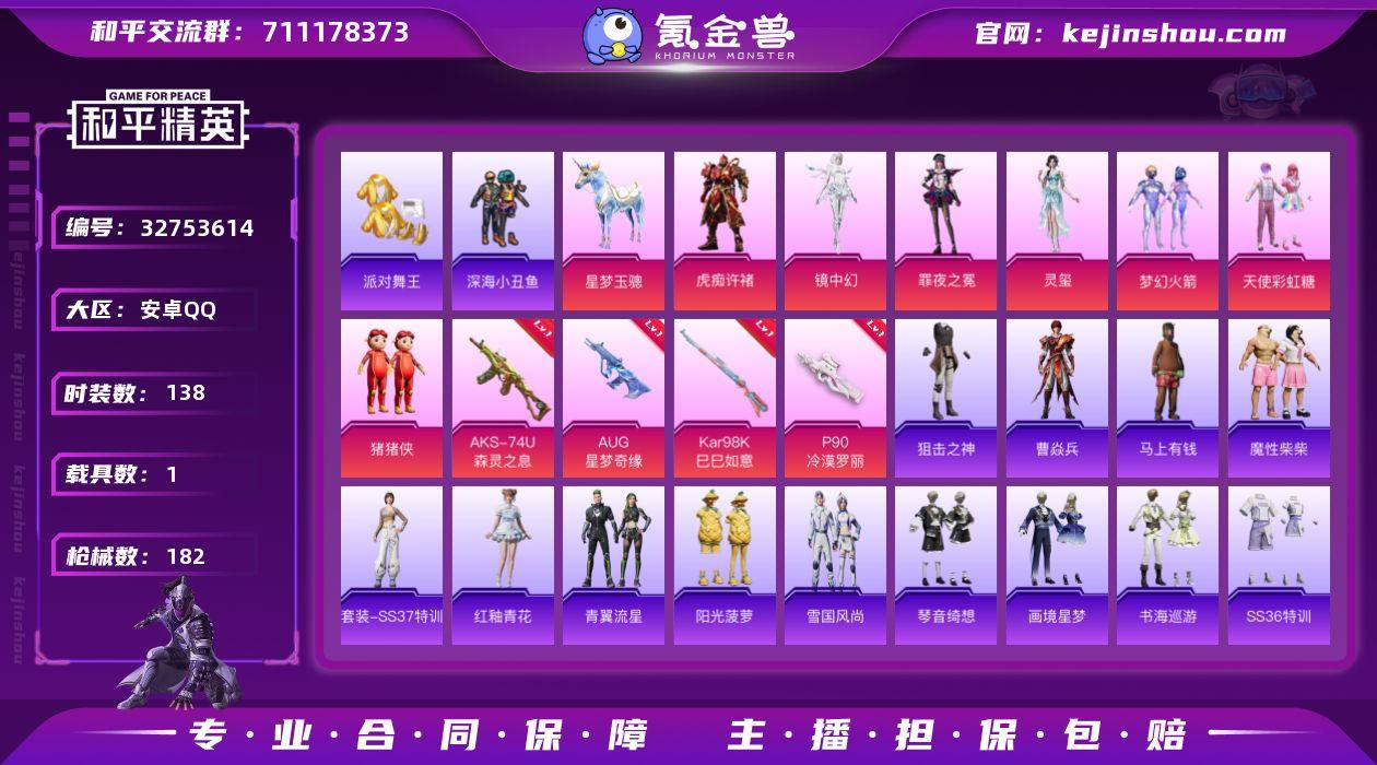 【连体号AUG星梦奇缘金鞋红眼罩7粉装6特效枪1载具 送王者3无双2珍品24传说281皮肤1典藏满马年 秒换绑不用等】 安卓Q区-54395热力值-138套装-182枪皮 【1载具】 星梦玉骢【2稀有】 派对舞王(金靴子) 红眼罩【7粉装】 梦幻火箭 天使彩虹糖 镜中幻 罪夜之冕 虎痴许褚 玩偶服-猪猪侠 角色-灵玺【6特效枪】 AUG-星梦奇缘(3级) AKS-74U-森灵之息(5级) Mk14-福马献瑞(2级) UMP45-萌骑冒险(4级) Kar98K-巳巳如意(5级) P90-冷漠罗丽(5级)【168热门】 深海小丑鱼 暗影哥特(红眼罩) 雪山精英(老6服) 小丑鱼 迅捷狂鲨 狂沙舞者 白色伏地魔 SS9特训 SS8特训 SS6特训 SS24特训 SS23特训 M762-乌木金纹 AKM-缤纷海域 M416-乌木金纹 GROZA-乌木金纹 SCAR-L-玉兔迎春 M762-天降萌叽 Mk47-乌木金纹 M416-夜灯 UMP45-蓝色火焰 MG3-幻世战舞者 AKM-星之彼岸 M416-神秘黑猫 M416-蓝色火焰 破蛋小黄鸡 长空猛禽 弄潮海豚 虚音幻奏 甜心亚梦 特训学院 燃烧卡路里 拳皇97八神庵 青涩时光 骑行爱好者 平底锅-五爪金龙 魅力单车 凛冬战士 黎明保卫者 竞技勇士朋克 坚韧舞者 漫步者 黑色伏地魔 海岛探路者 春日漫步 粉红小猪 AA12-G-雨过天青 沙漠之鹰-雨过天青 平底锅-画境星梦 超感刻度 GROZA-紫矿核...