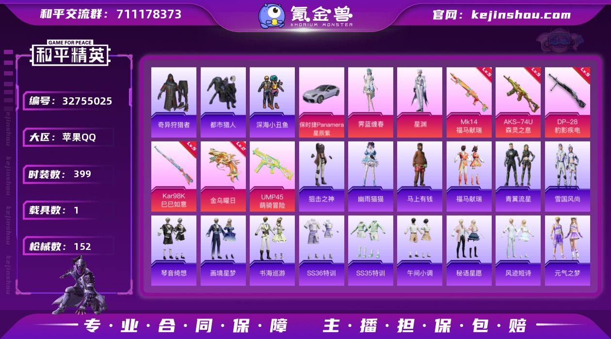 实名: 可修改 时装数: 399 载具数: 1 枪械数: 152 战备数: 1 热门装扮: 奇异狩猎者,呆萌铁蟹,深海小丑鱼,鹰眼刺客,都市猎人,星渊,霁蓝缠春 载具: 保时捷Panamera(星辰紫) 稀有枪皮: Kar98K-巳巳如意,DP-28-豹影疾电,AKS-74U-森灵之息,MK14-福马献瑞,UMP45-萌骑冒险,信号枪-金乌曜日 亮点: 【优质装备】:都市猎人,奇异狩猎者